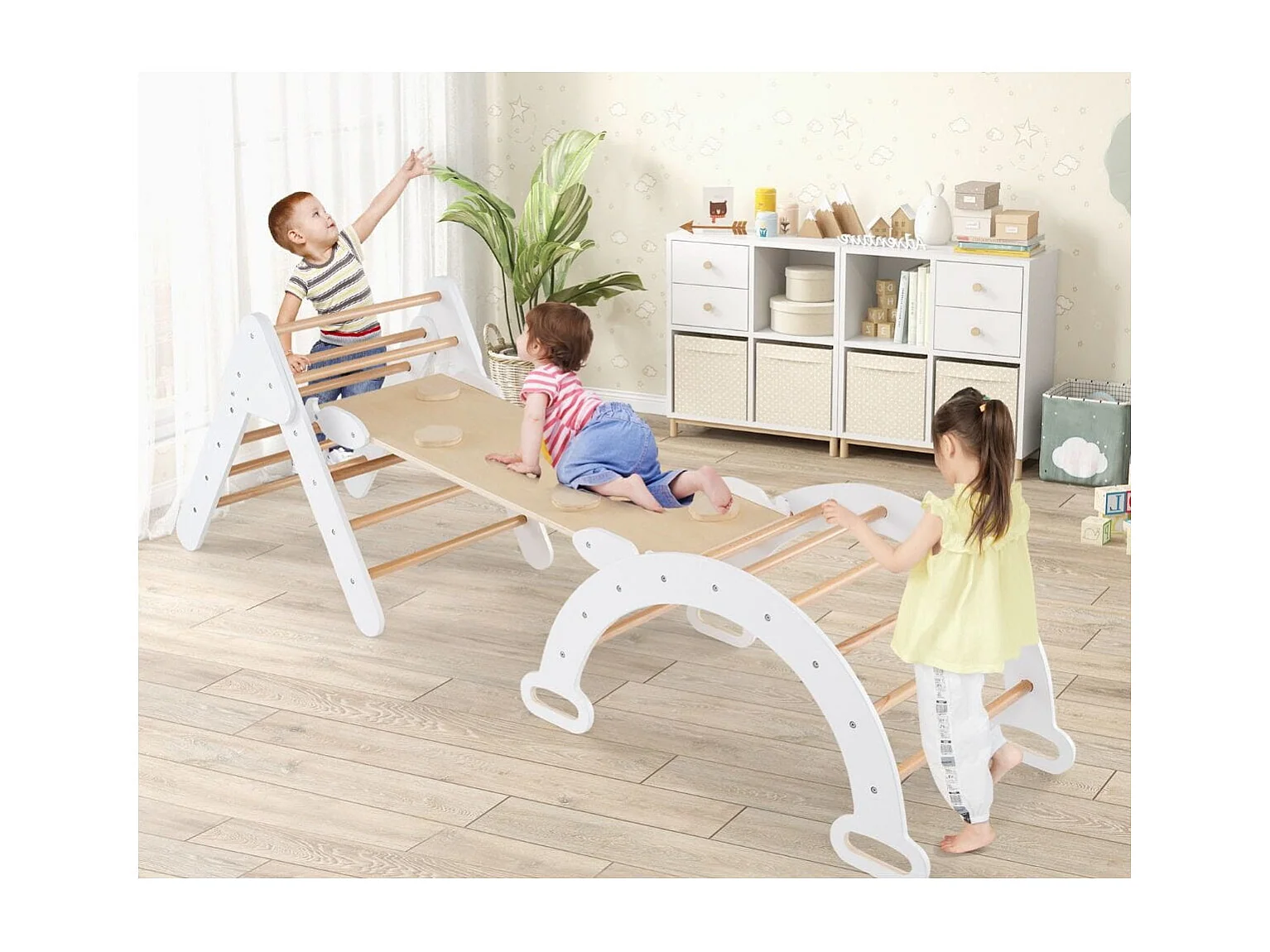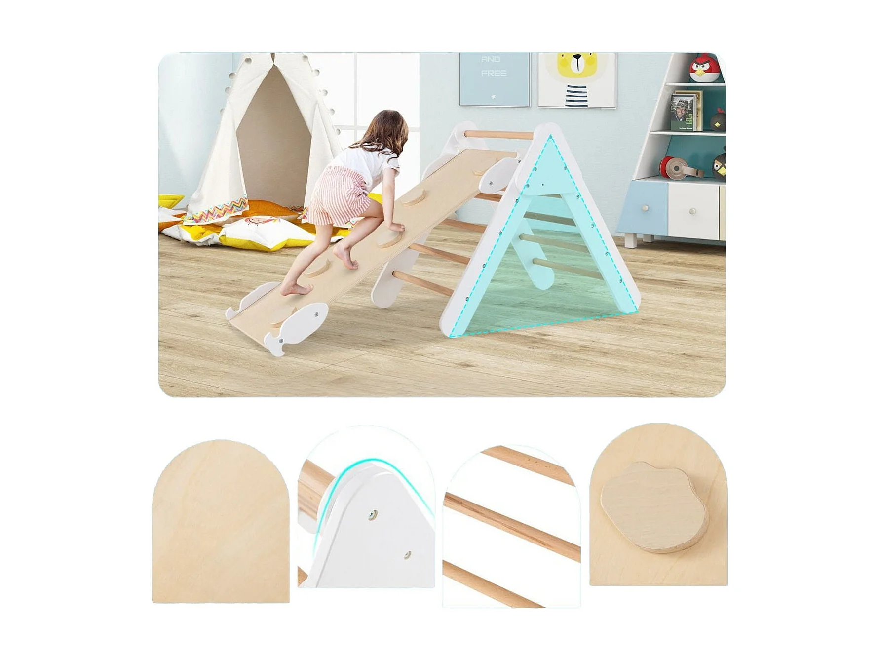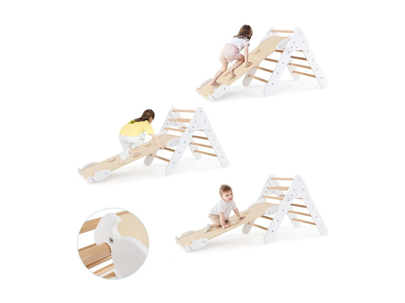 7 en 1 Triangle Arche Montessori d'Escalade Enfants avec Toboggan Bois Rampe Échelle Réglable Aire de Jeux pour 3 Ans+ Blanc+Naturel