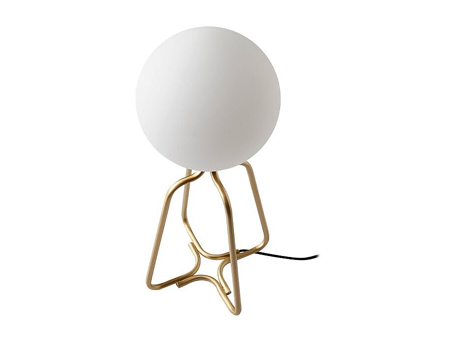 Lampe de bureau avec corps en acier doré et ampoule en verre teinté blanc.