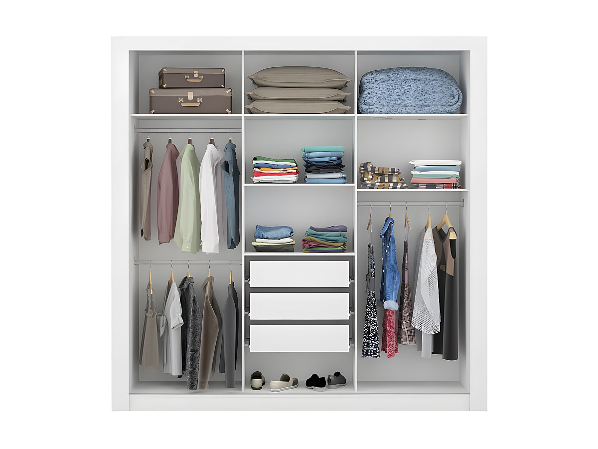 - Intérieur: 3 penderies, 6 étagères et 3 tiroirs