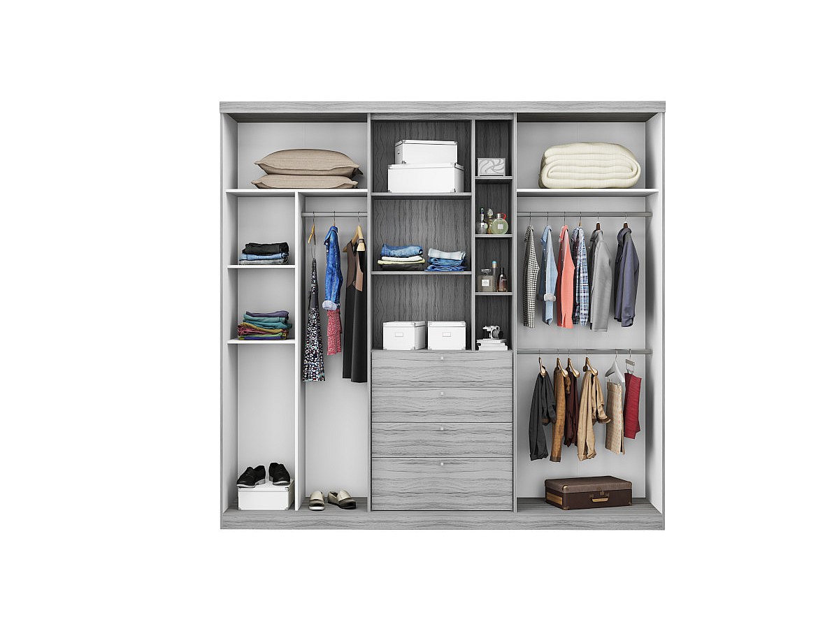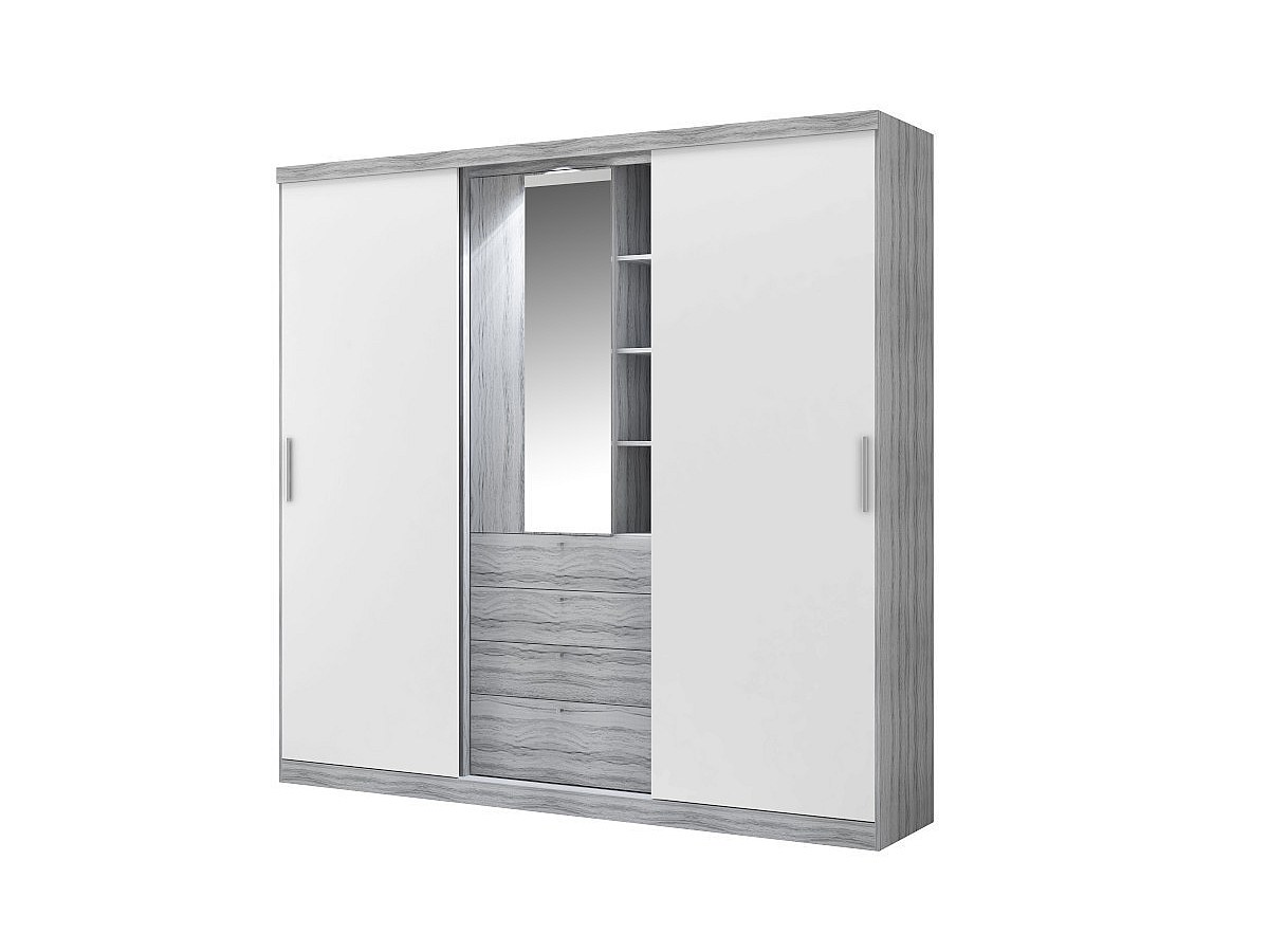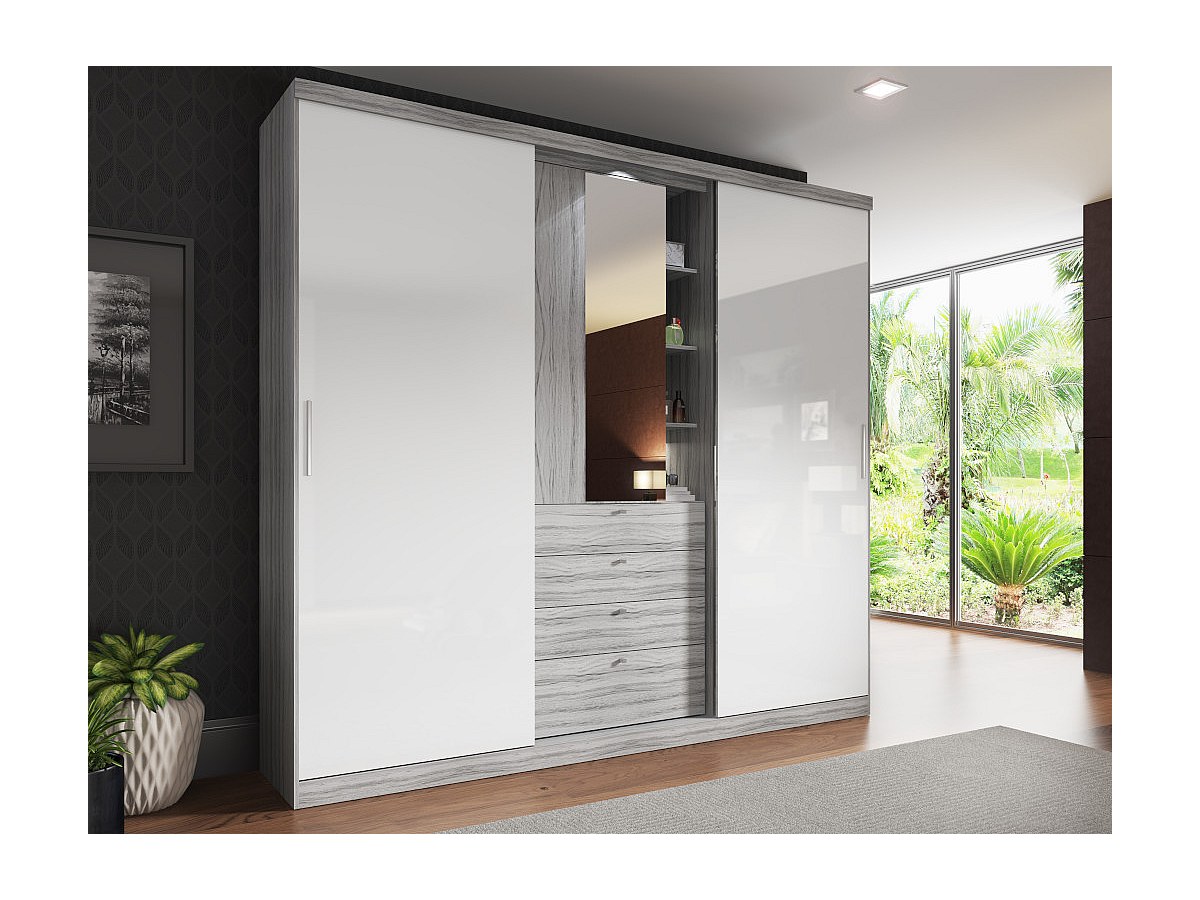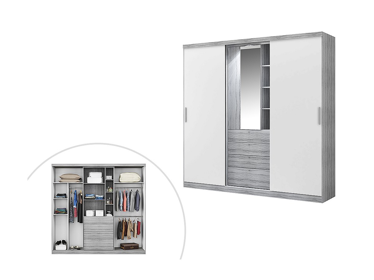 Armoire BODIL - portes coulissantes - Miroir et tiroirs - L240cm - Gris et blanc