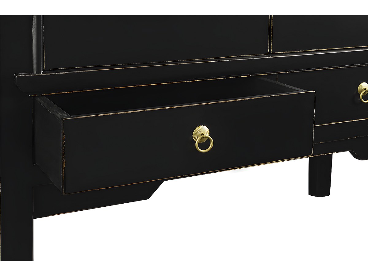 Donnez une dimension zen et exotique à votre séjour ou votre chambre avec cette armoire. Sa structure en bois et sa fermeture ronde en cuivre (symbolisant la plénitude) sont fidèles à l'esprit des armoires de mariage utilisées autrefois en Chine pour ranger les présents reçus lors de la cérémonie.