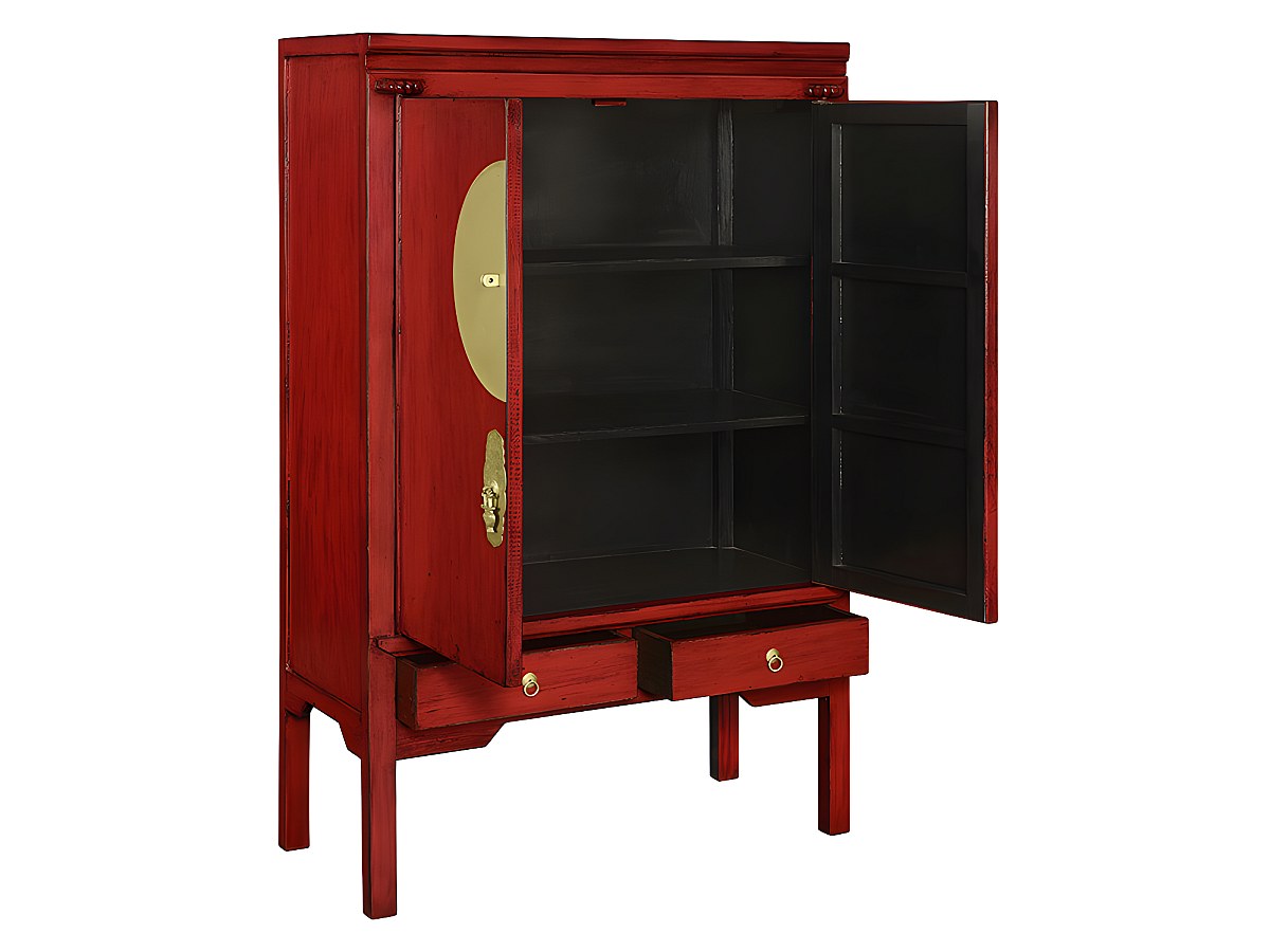 Donnez une dimension zen et exotique à votre séjour ou votre chambre avec cette armoire. Sa structure en bois et sa fermeture ronde en cuivre (symbolisant la plénitude) sont fidèles à l'esprit des armoires de mariage utilisées autrefois en Chine pour ranger les présents reçus lors de la cérémonie.