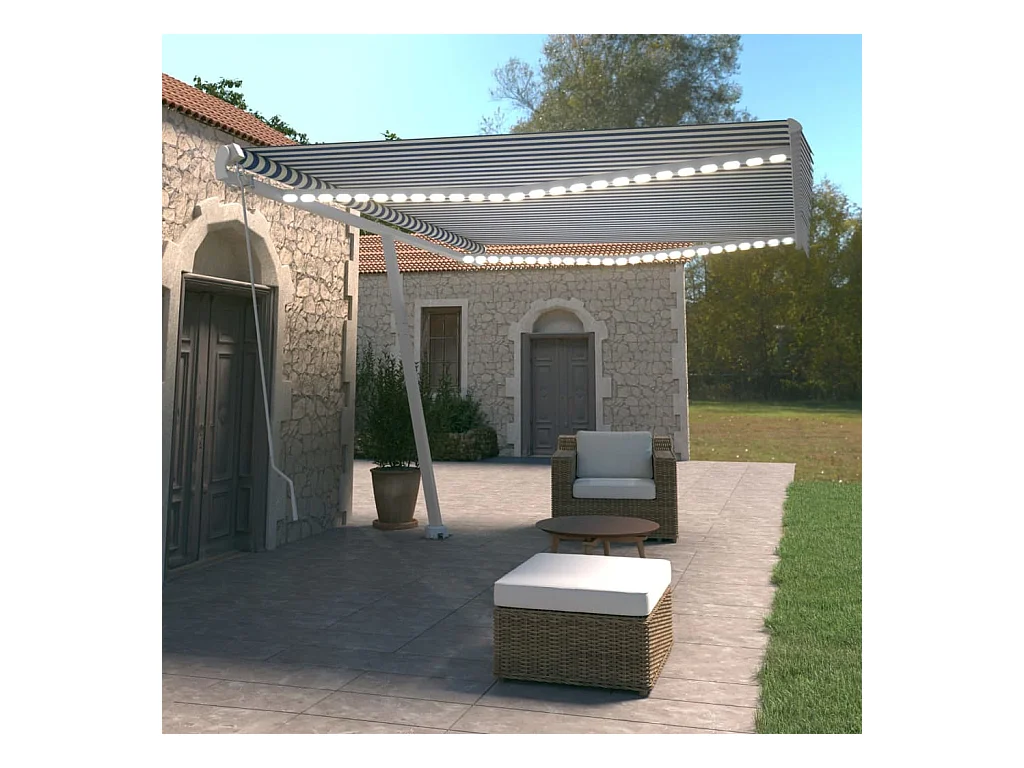 Auvent manuel rétractable avec LED 500x350 cm Bleu et blanc