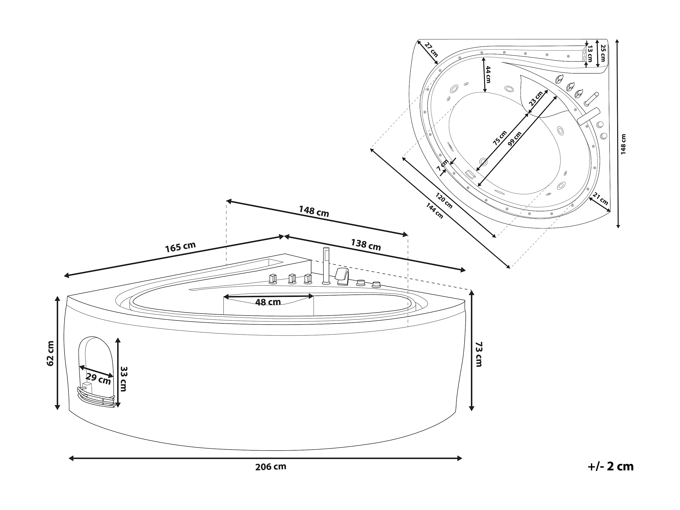 Baignoire d'angle à remous avec LED PELICAN 206 x 165 cm Blanc