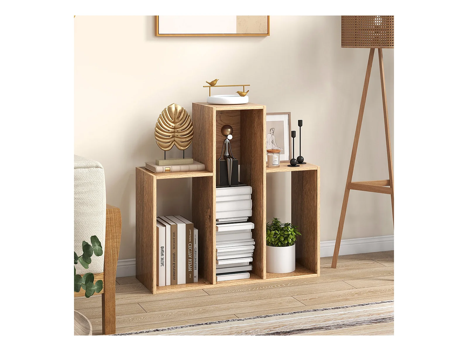 Bibliothèque convexe avec protection anti-basculement 3 niveaux Étagère sur pied Séparateur de pièce 29,5 x 84 x 83,5 cm Naturel