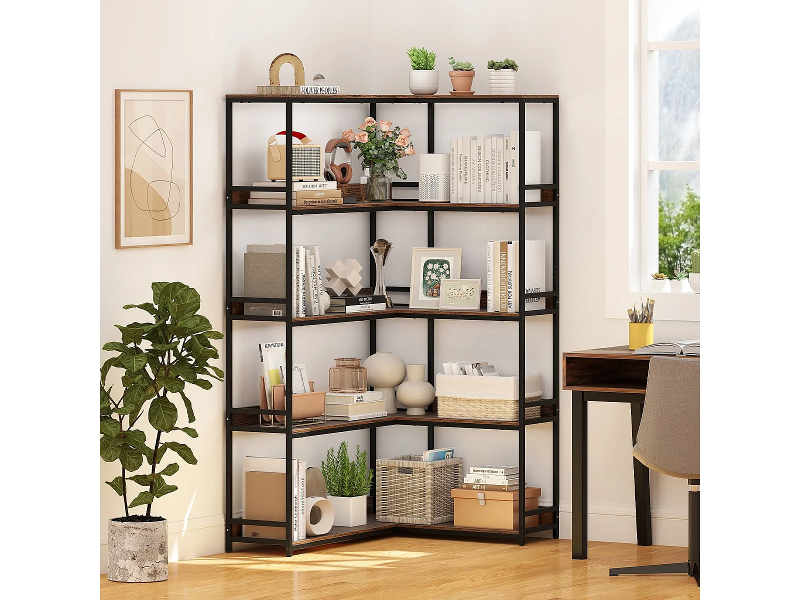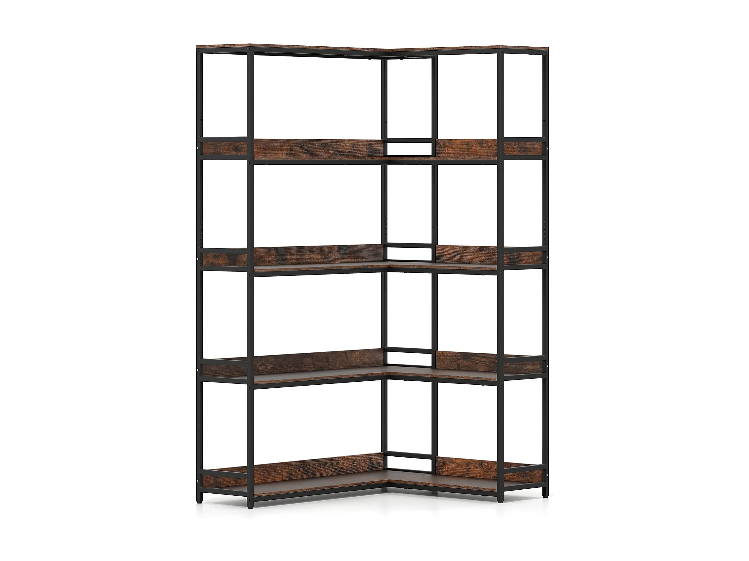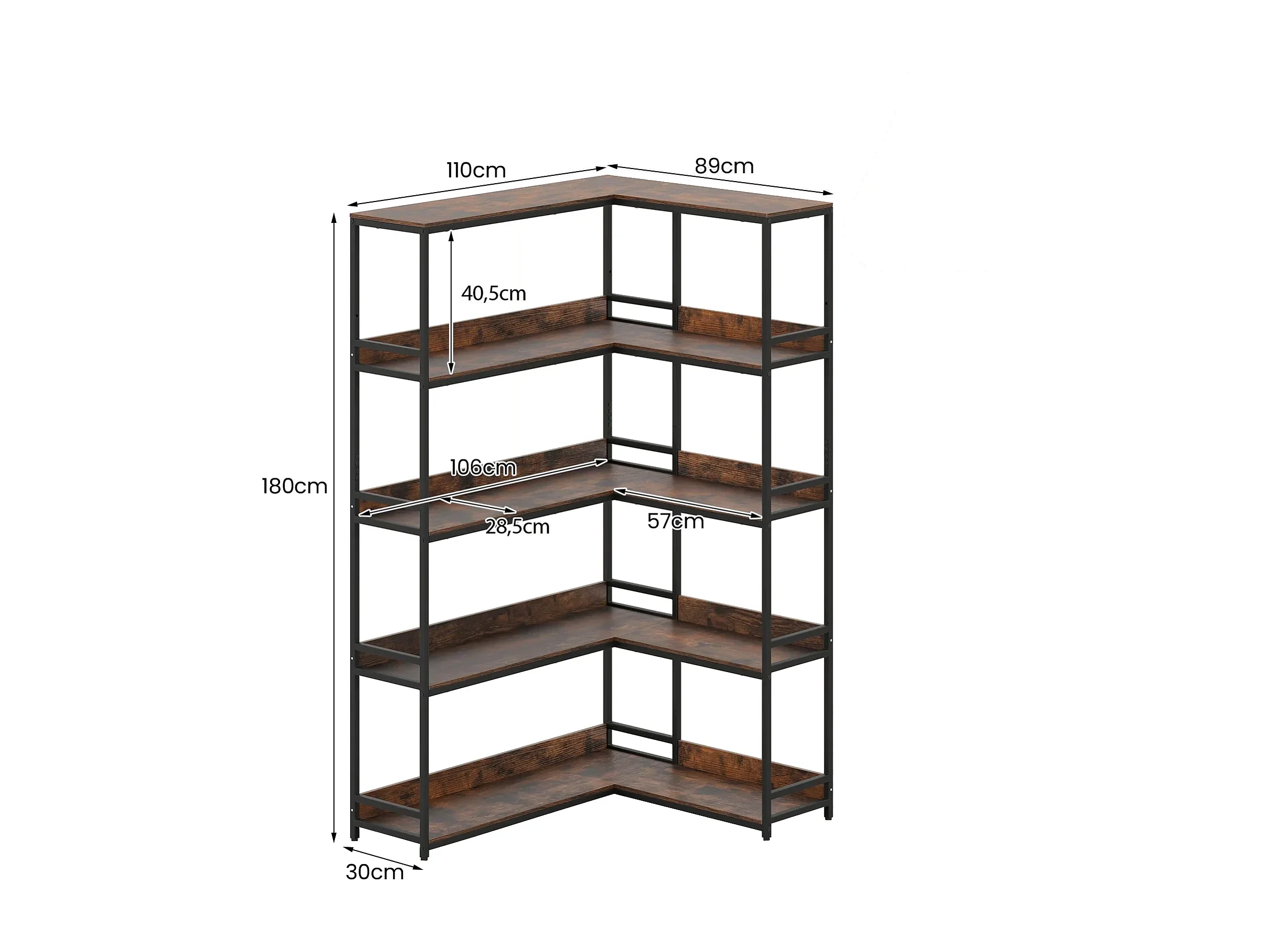 Bibliothèque en forme de L à 5 niveaux Bibliothèque d'angle industrielle ouverte Étagère de stockage Rustique Marron