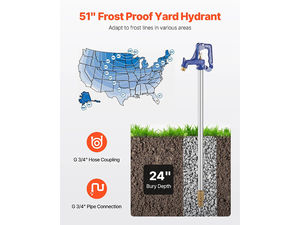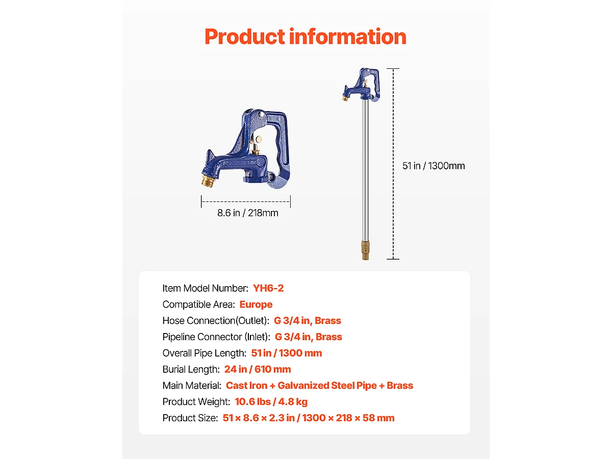 Borne d'Incendie SucceBuy de Jardin Antigel, Longueur de 130cm, Profondeur d'Enfouissement de 61cm, Fonte Robuste