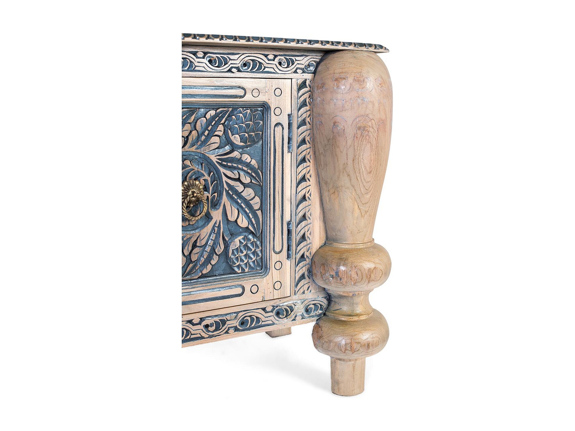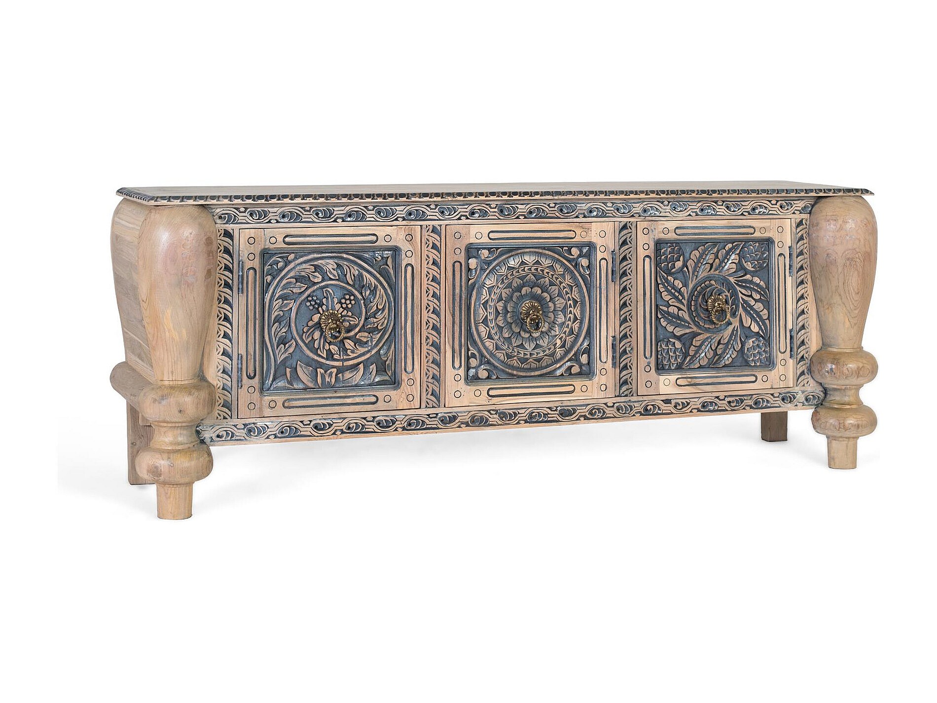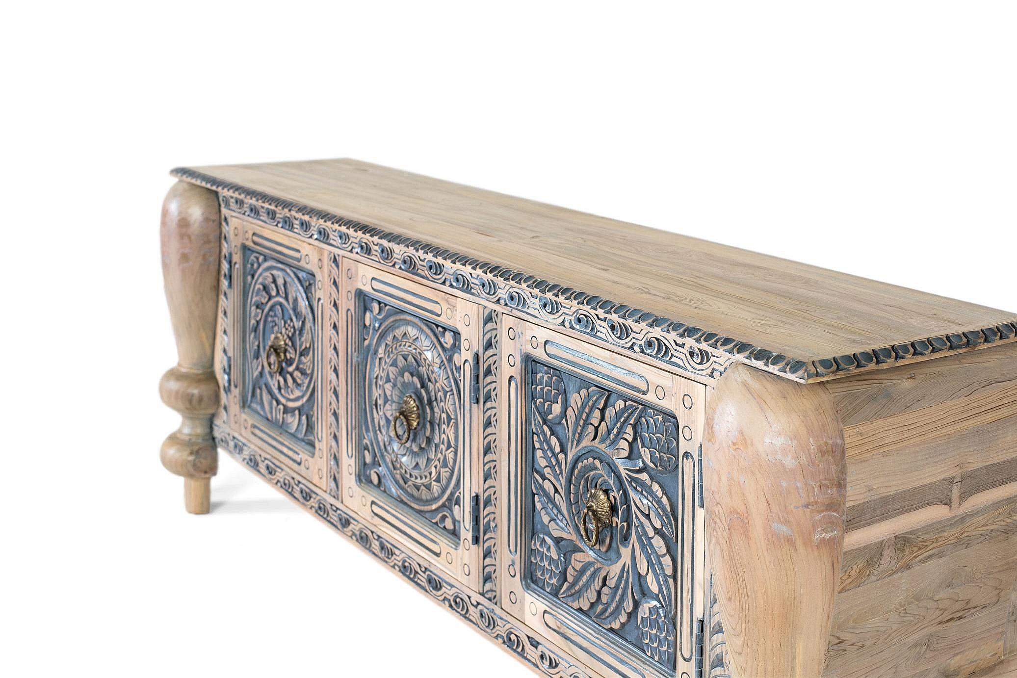 Buffet artisanal en teck massif avec sculpture et pieds robustes