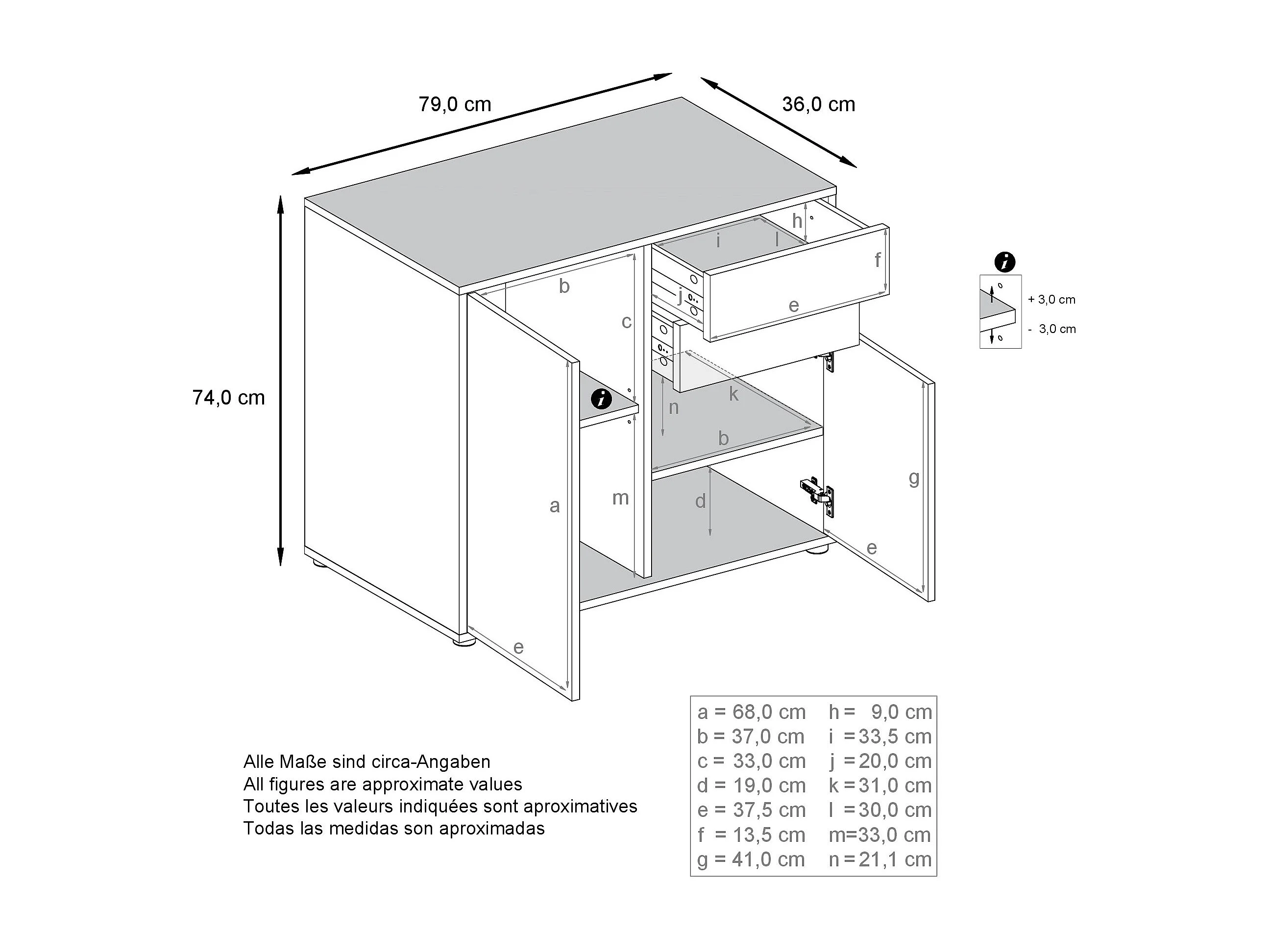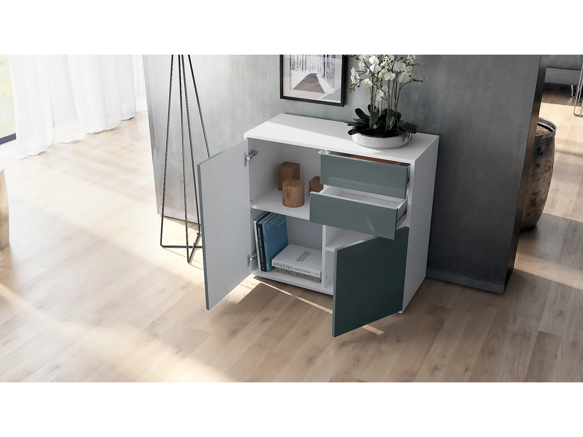 Buffet Ben, Commode avec 2 portes et 2 tiroirs, Blanc mat/Blanc mat (79 x 74 x 36 cm)