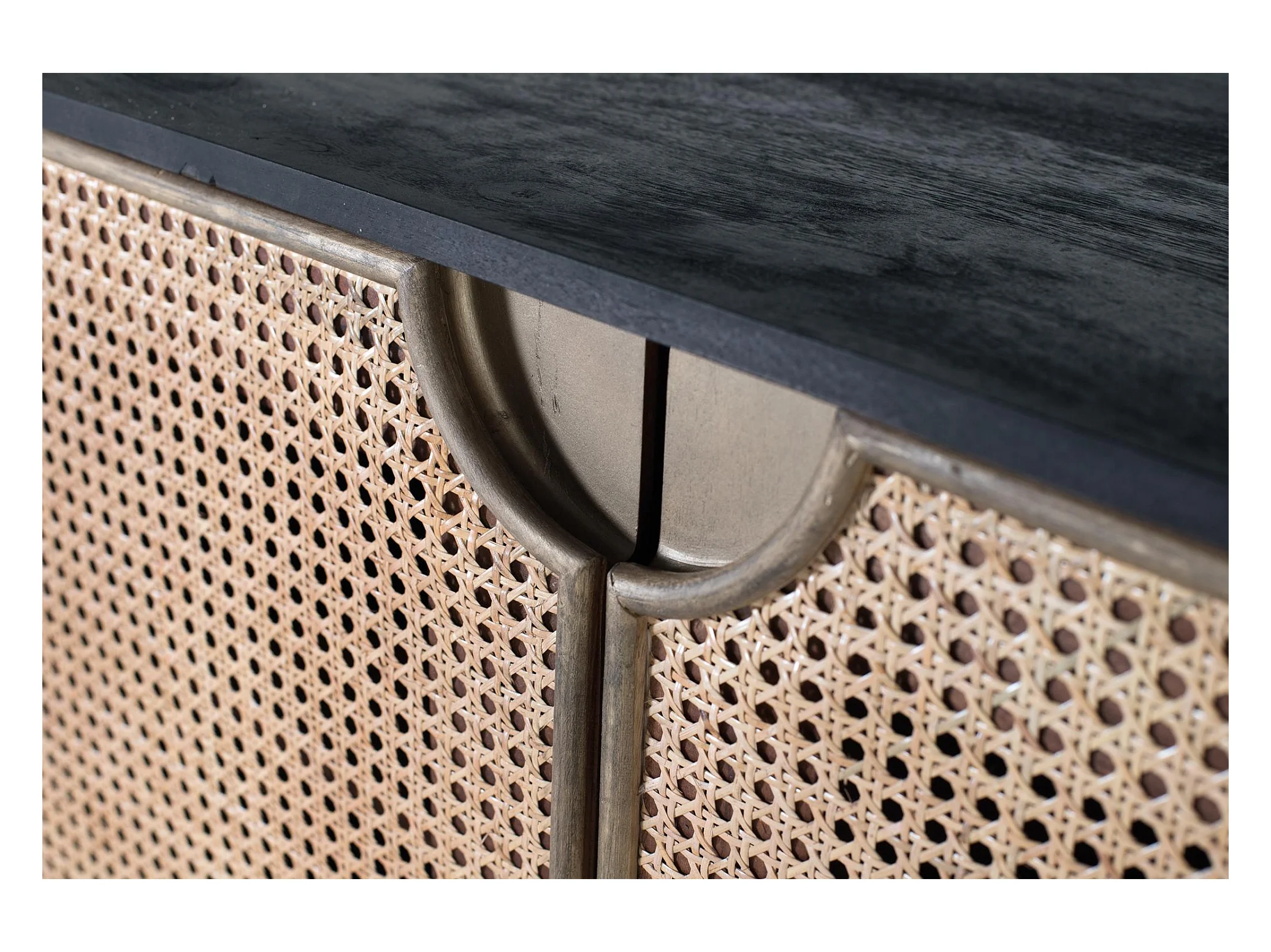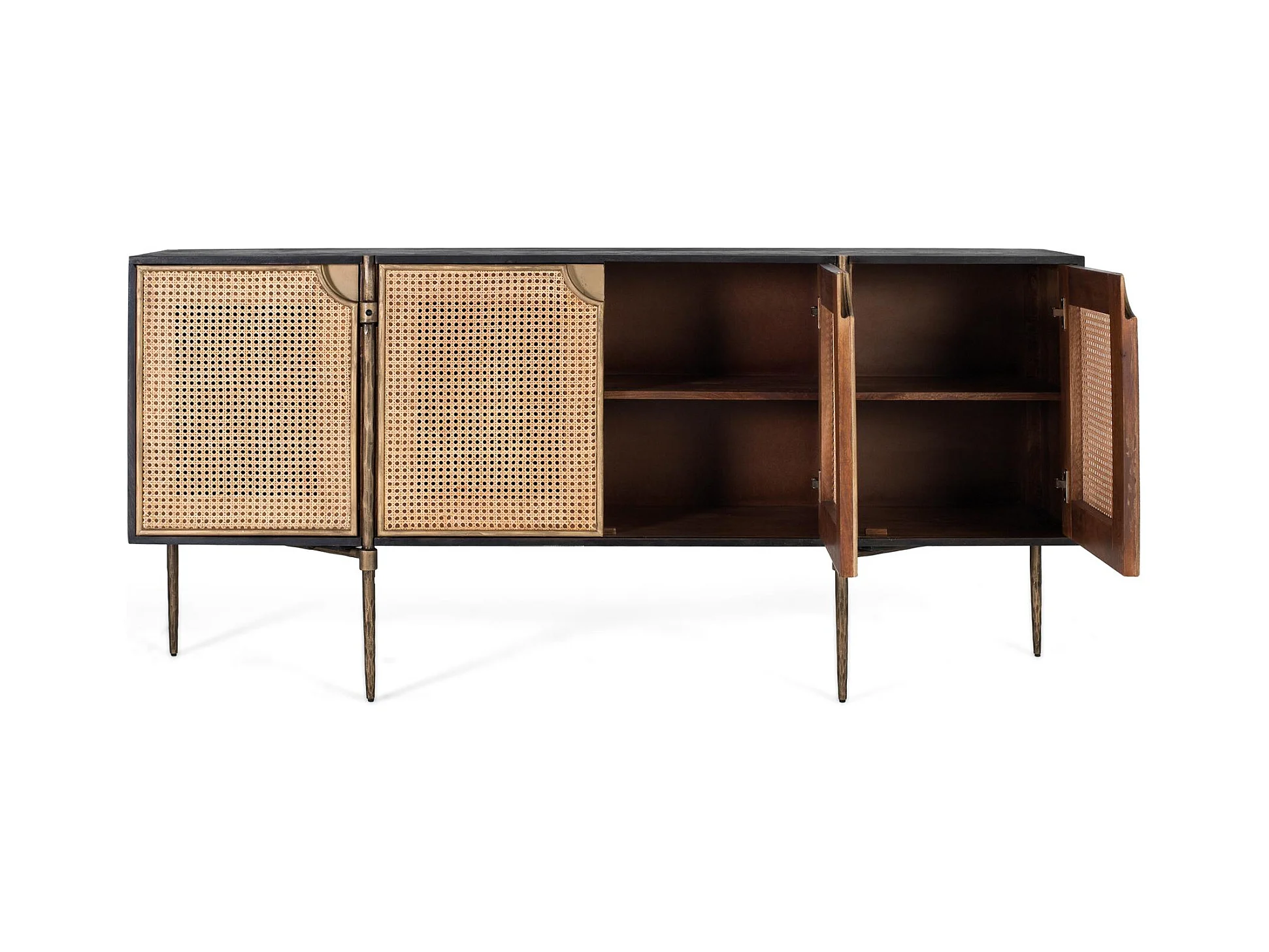Buffet en bois foncé et portes en rotin tressé avec pieds métalliques