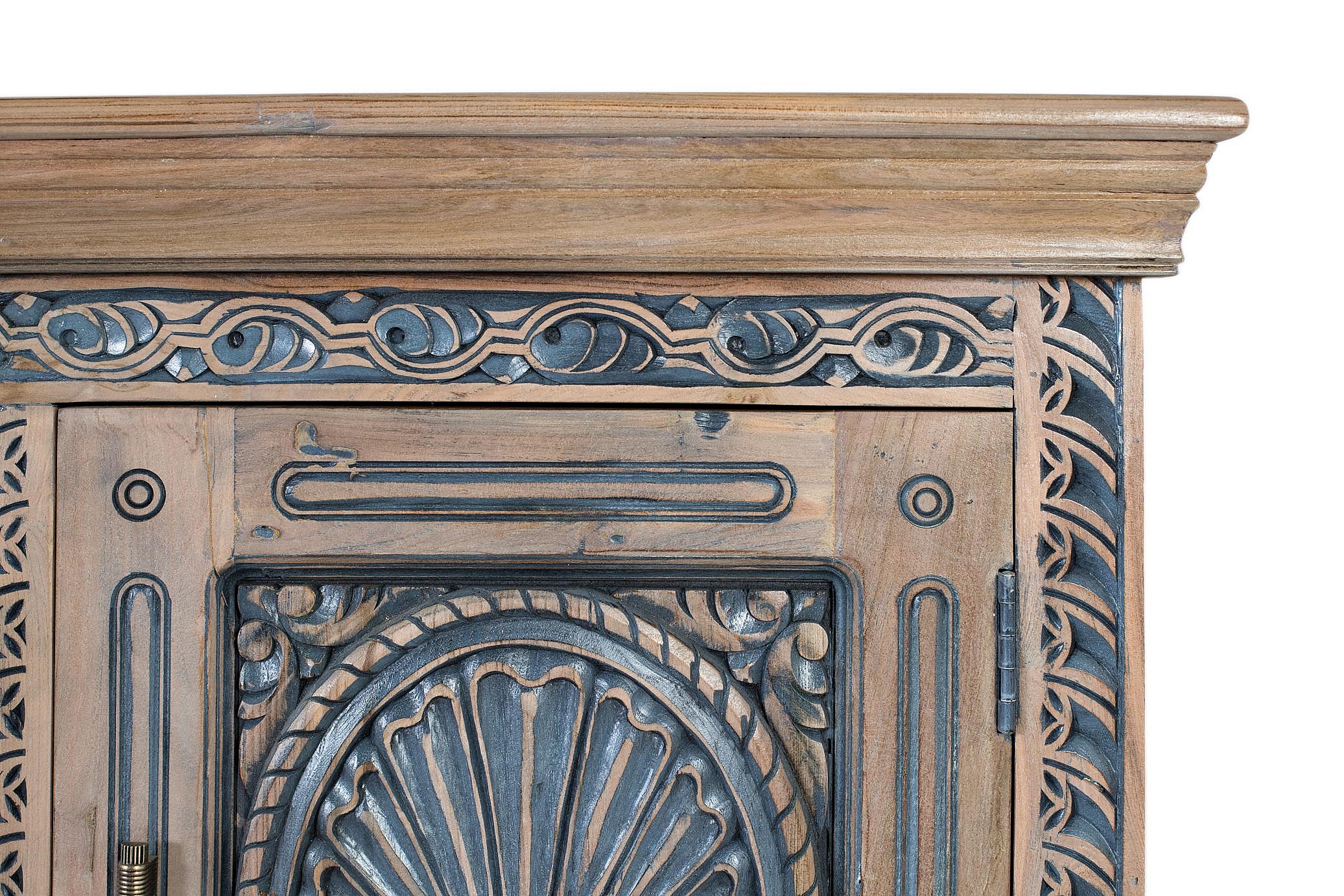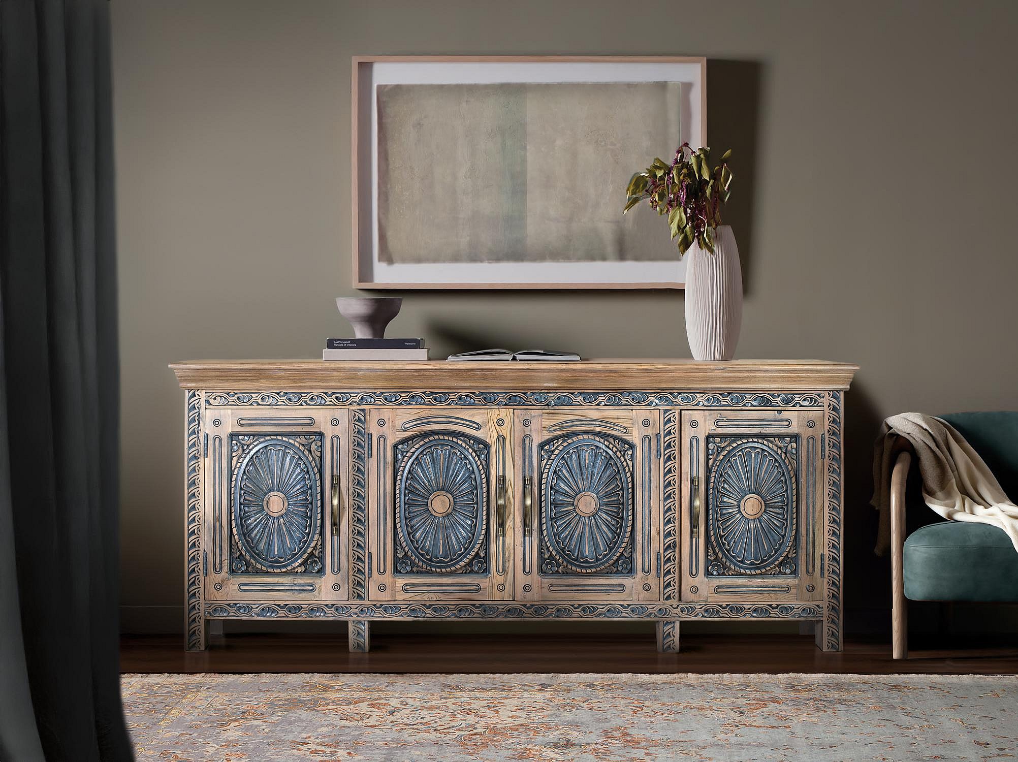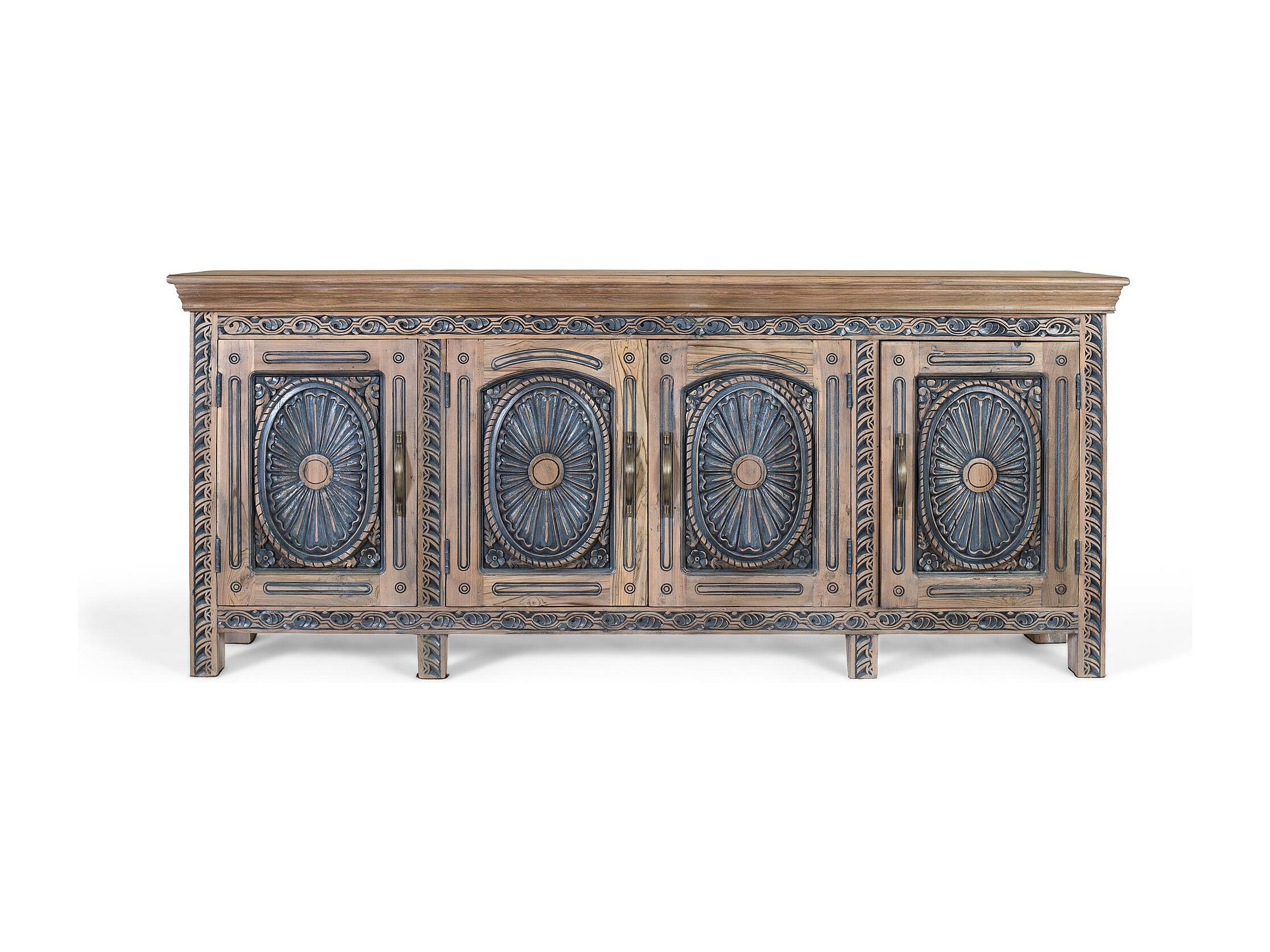 Buffet en teck sculpté bicolore, naturel et bleu vieilli