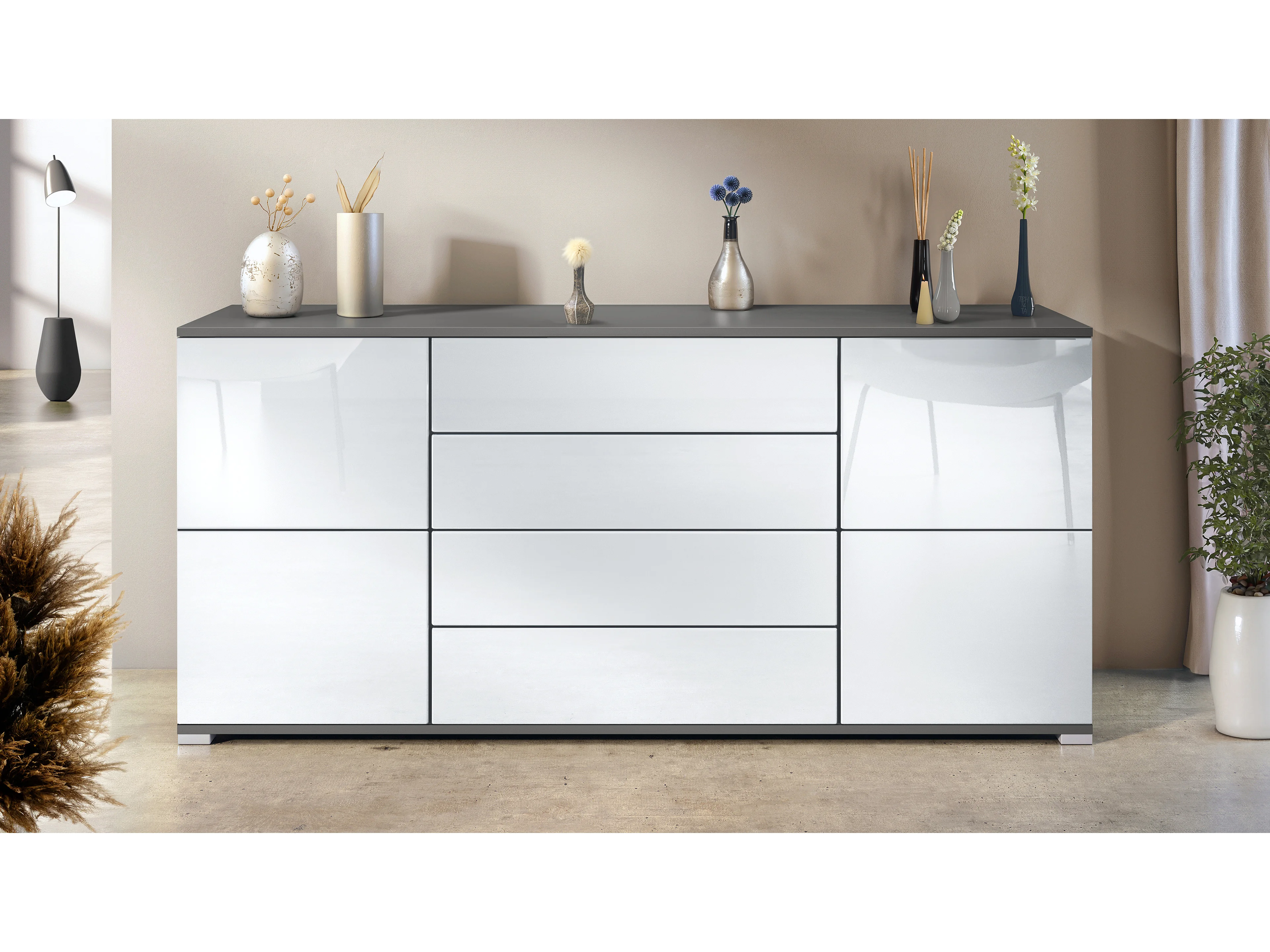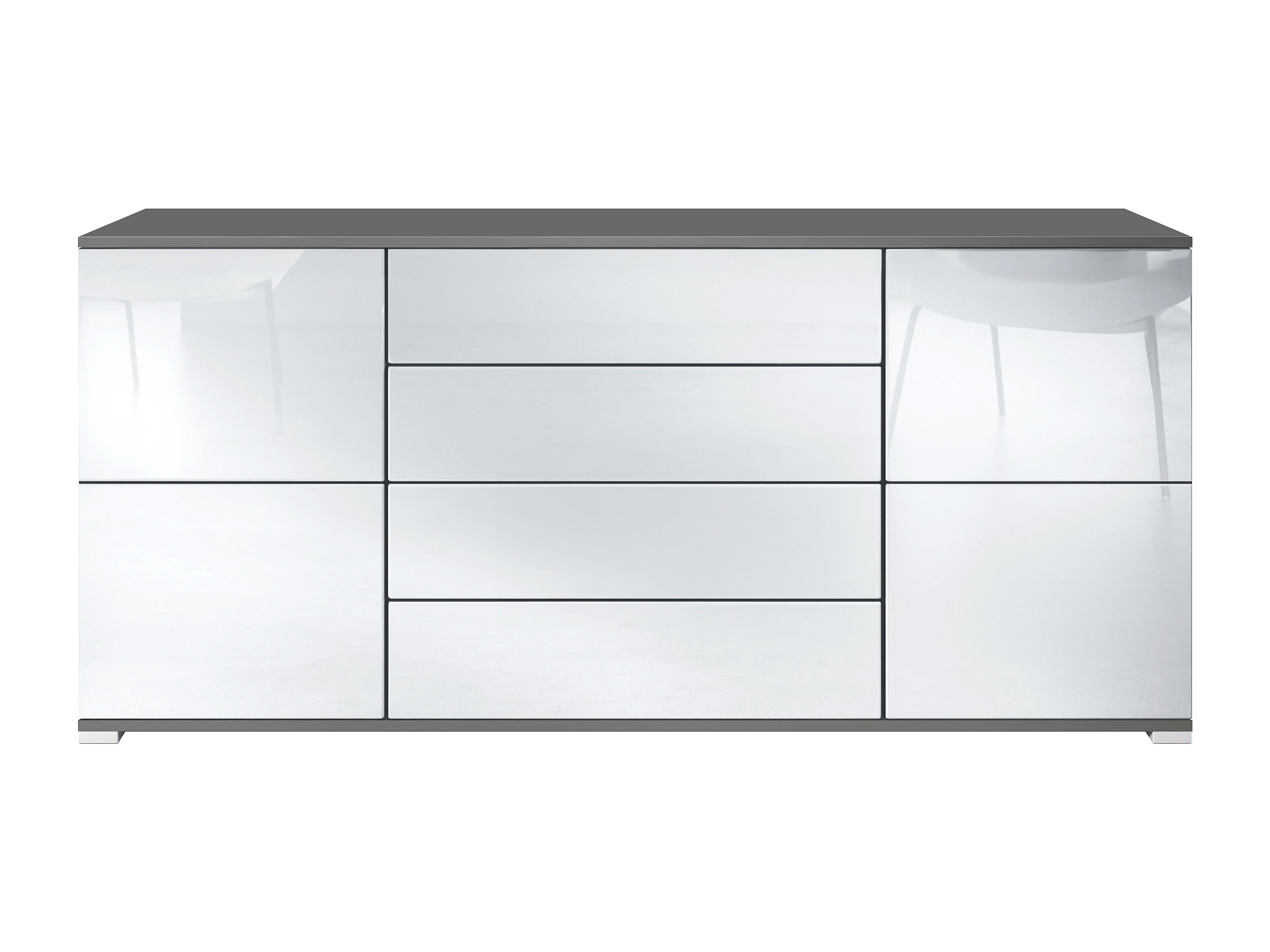 Buffet Sylt V2, Commode avec 2 Portes et 4 Tiroirs, Corps - anthracite mat / Façade - blanc haute brillance / Détails - noir haute brillance (166,5 x 75,5 x 35 cm)