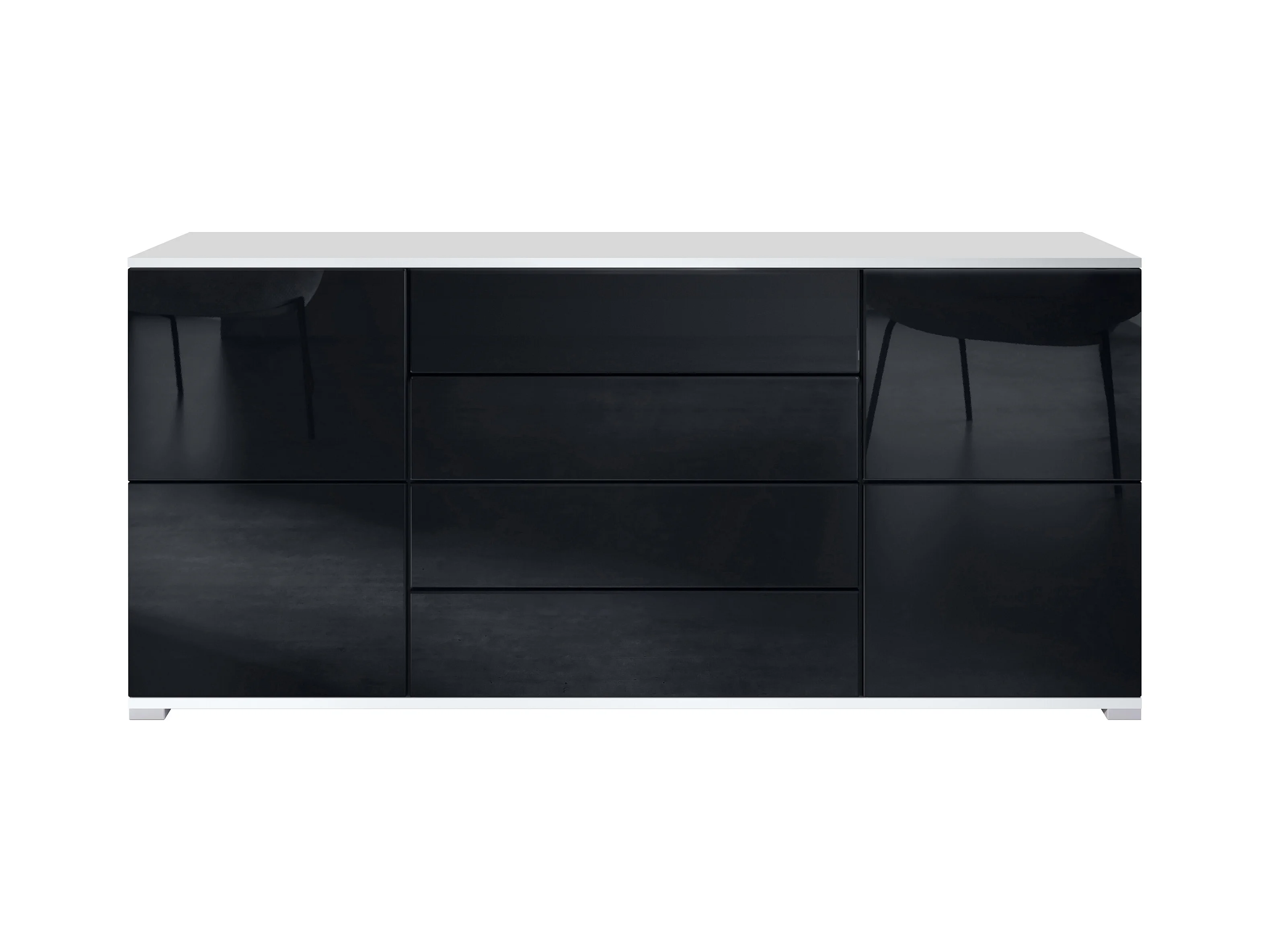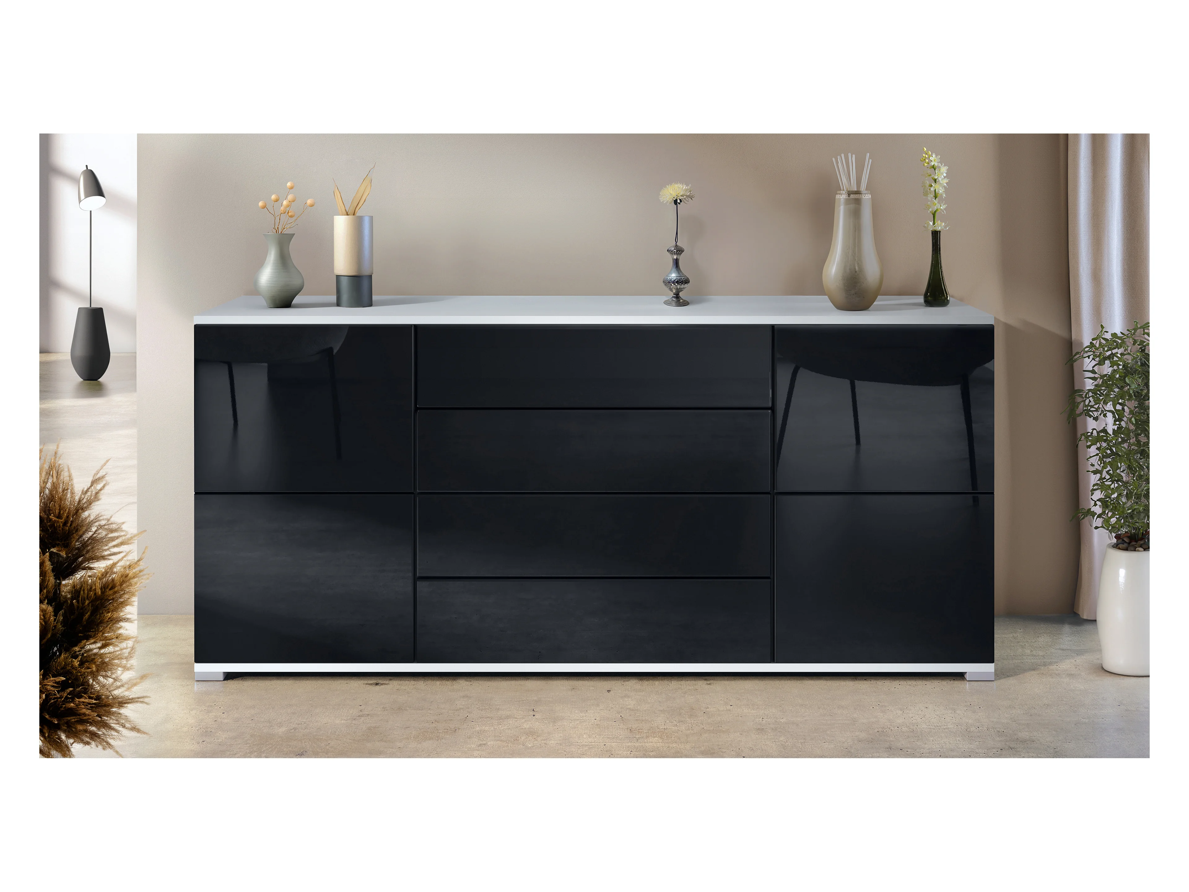 Buffet Linio V2 – Commode moderne avec 2 portes et 4 tiroirs, blanc mat/noir haute brillance, 166,5 x 75,5 x 35 cm (L x H x P) – Meuble de rangement bahut