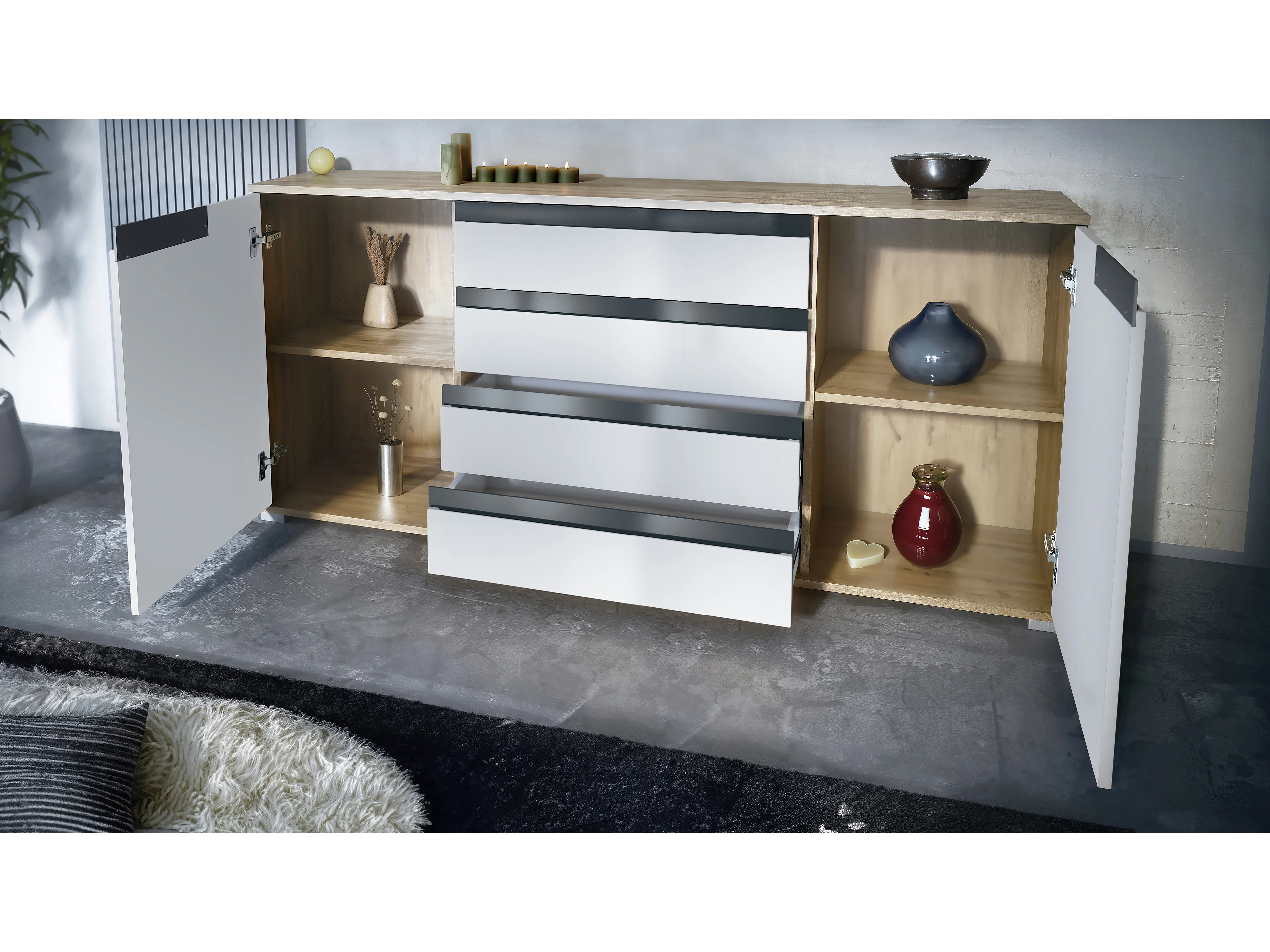 Buffet Sylt V2, Commode avec 2 Portes et 4 Tiroirs, Corps - anthracite mat / Façade - blanc haute brillance / Détails - noir haute brillance (166,5 x 75,5 x 35 cm)