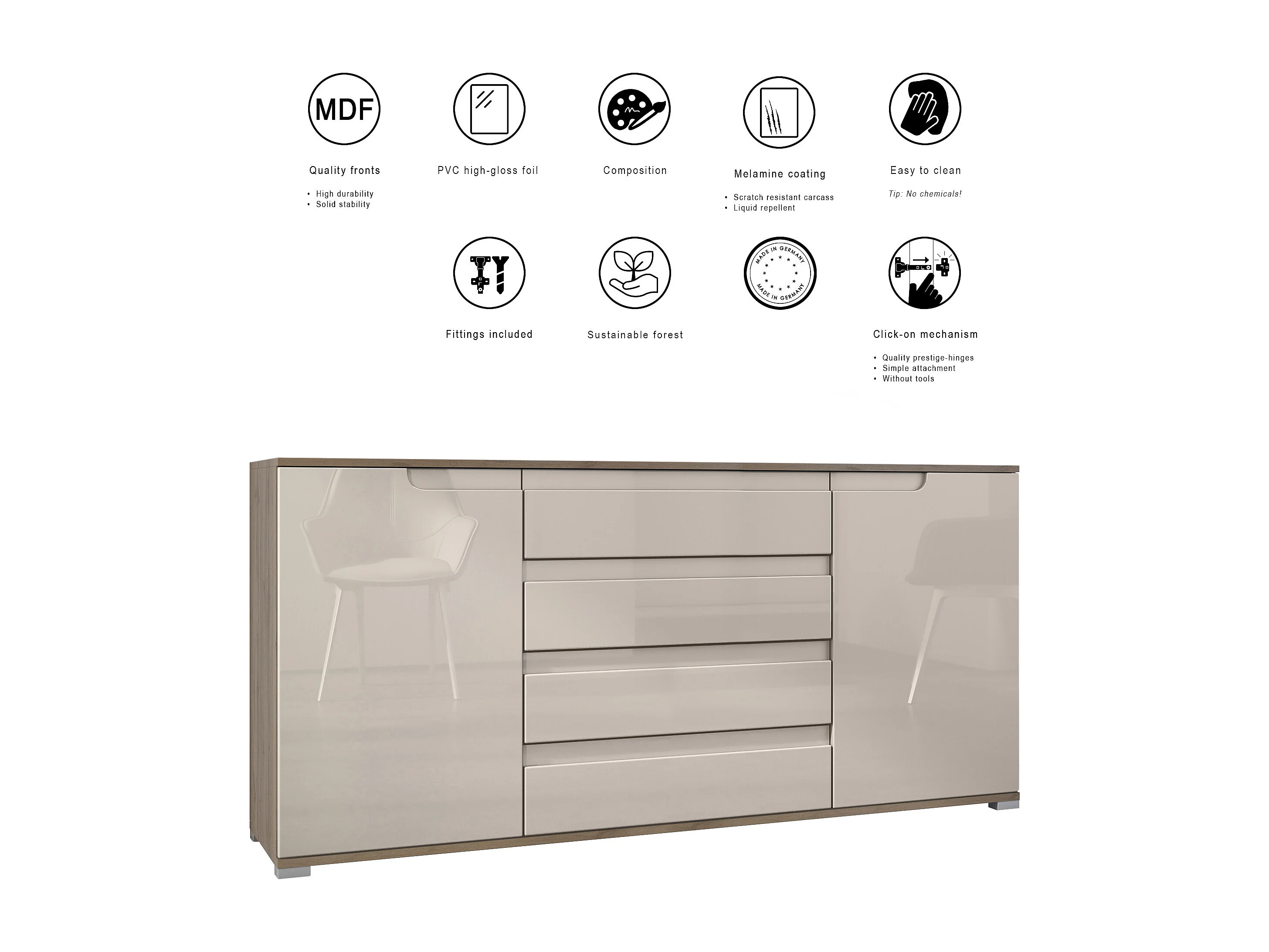 Buffet Sylt V2, Commode avec 2 Portes et 4 Tiroirs, Corps - Chêne Evoke / Façade - blanc haute brillance / Détails - blanc haute brillance (166,5 x 75,5 x 35 cm)