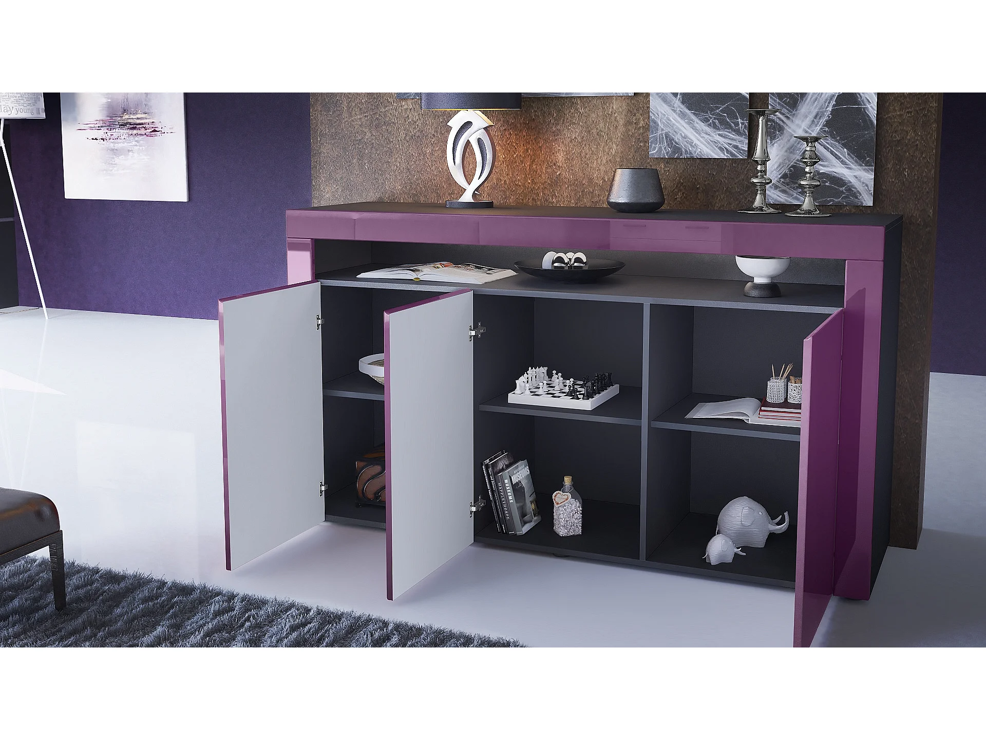 Buffet Sylt V2, Commode avec 2 Portes et 4 Tiroirs, Corps - blanc mat / Façade - gris haute brillance / Détails - mûre haute brillance (166,5 x 75,5 x 35 cm)