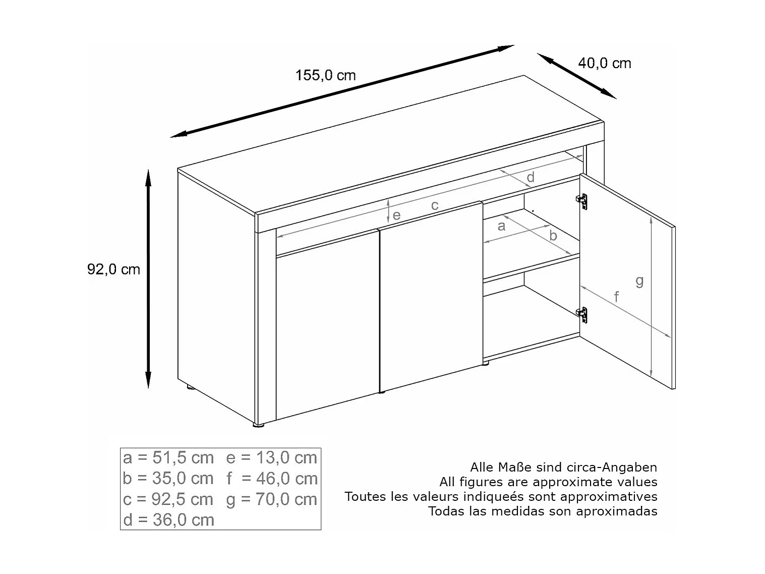 Buffet Valencia, Commode avec 3 portes et 1 compartiment ouvert, Noir mat/gris haute brillance/gris haute brillance (155 x 92 x 40 cm)