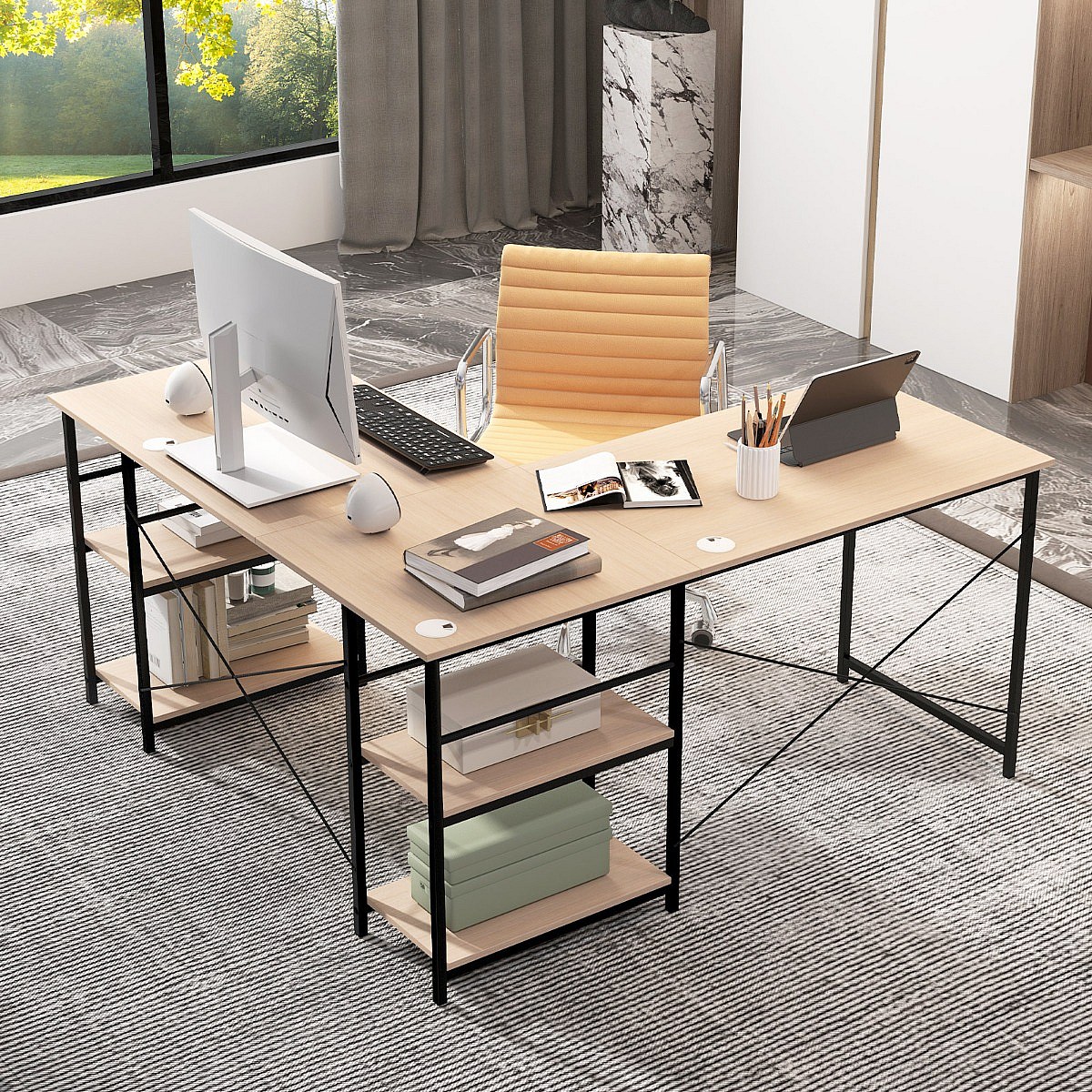 Bureau d'Angle 151 x 151 x 75 CM Ajustable à Bureau Droit 4 Etagère de Rangement Grand Table pour 2 Personnes Naturel