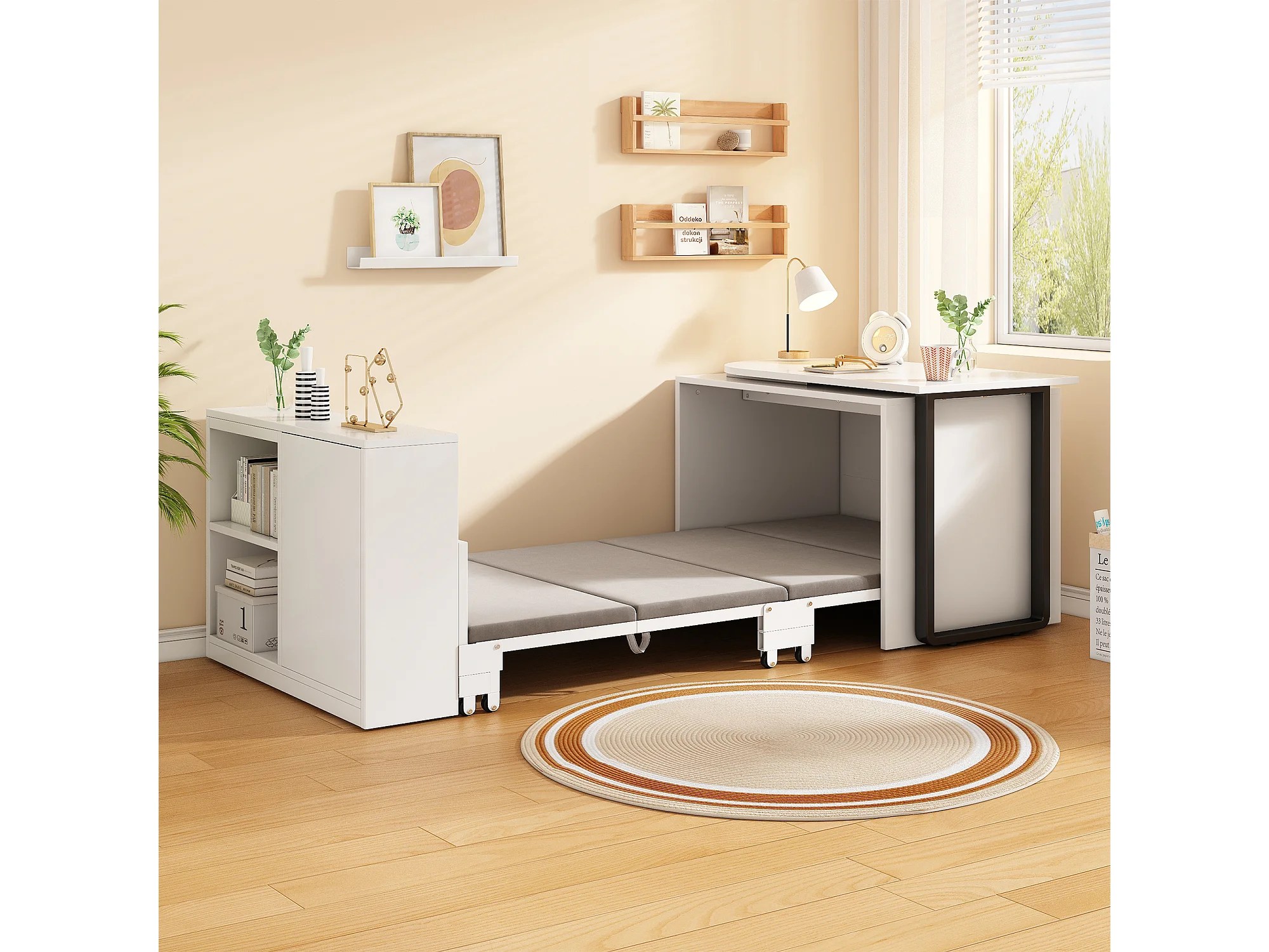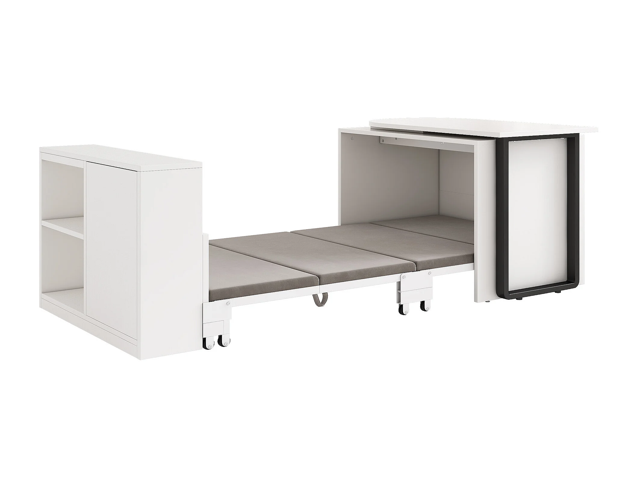 Bureau/lit pliant 2 en 1 - Structure et pieds en métal - Matelas de 4 cm d'épaisseur - 2 compartiments de rangement - Blanc
