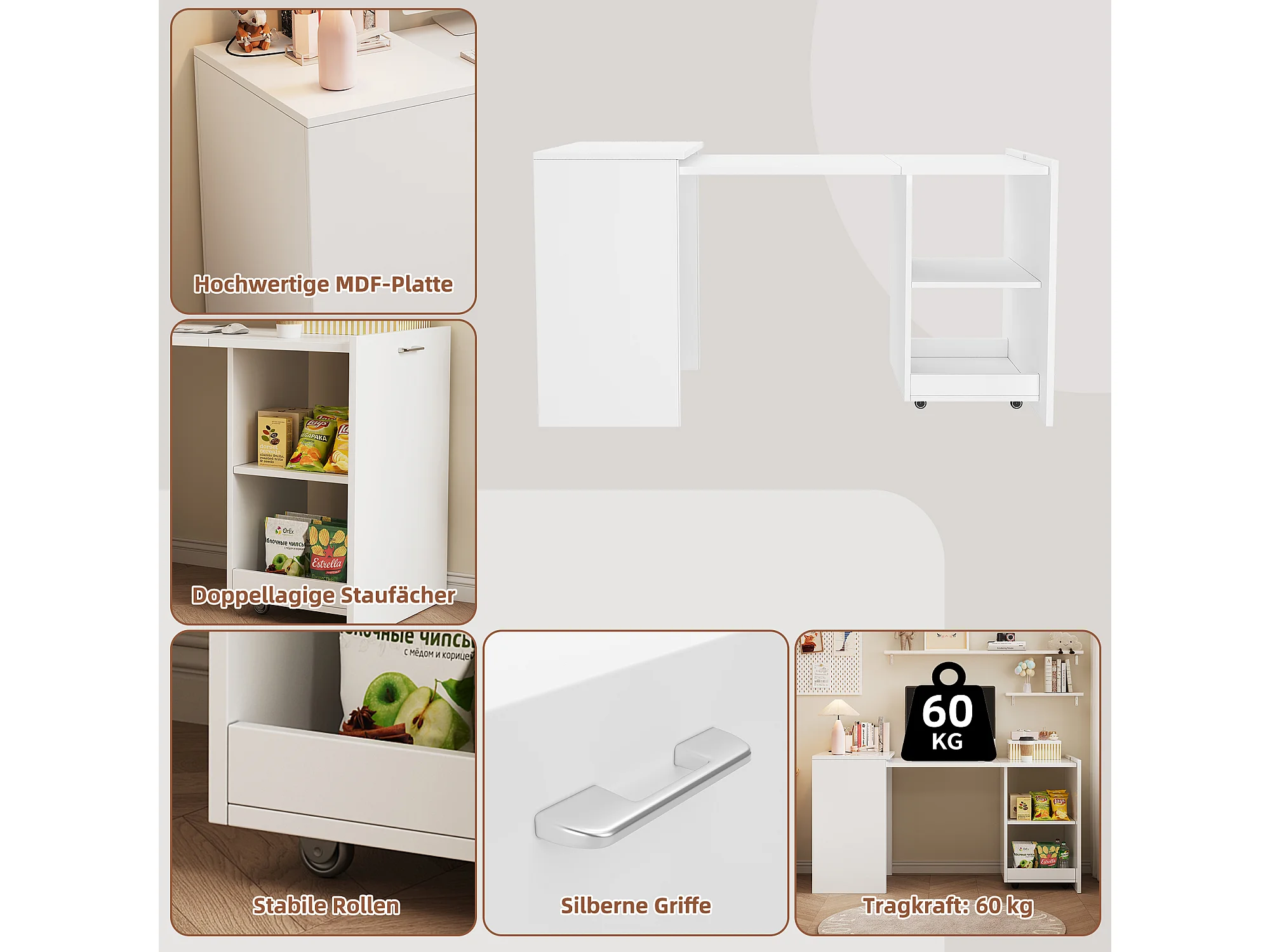 Bureau pliant mobile 126x55x72.5 cm - Bureau et rangement - 2 compartiments de rangement - Panneaux de particules - Blanc