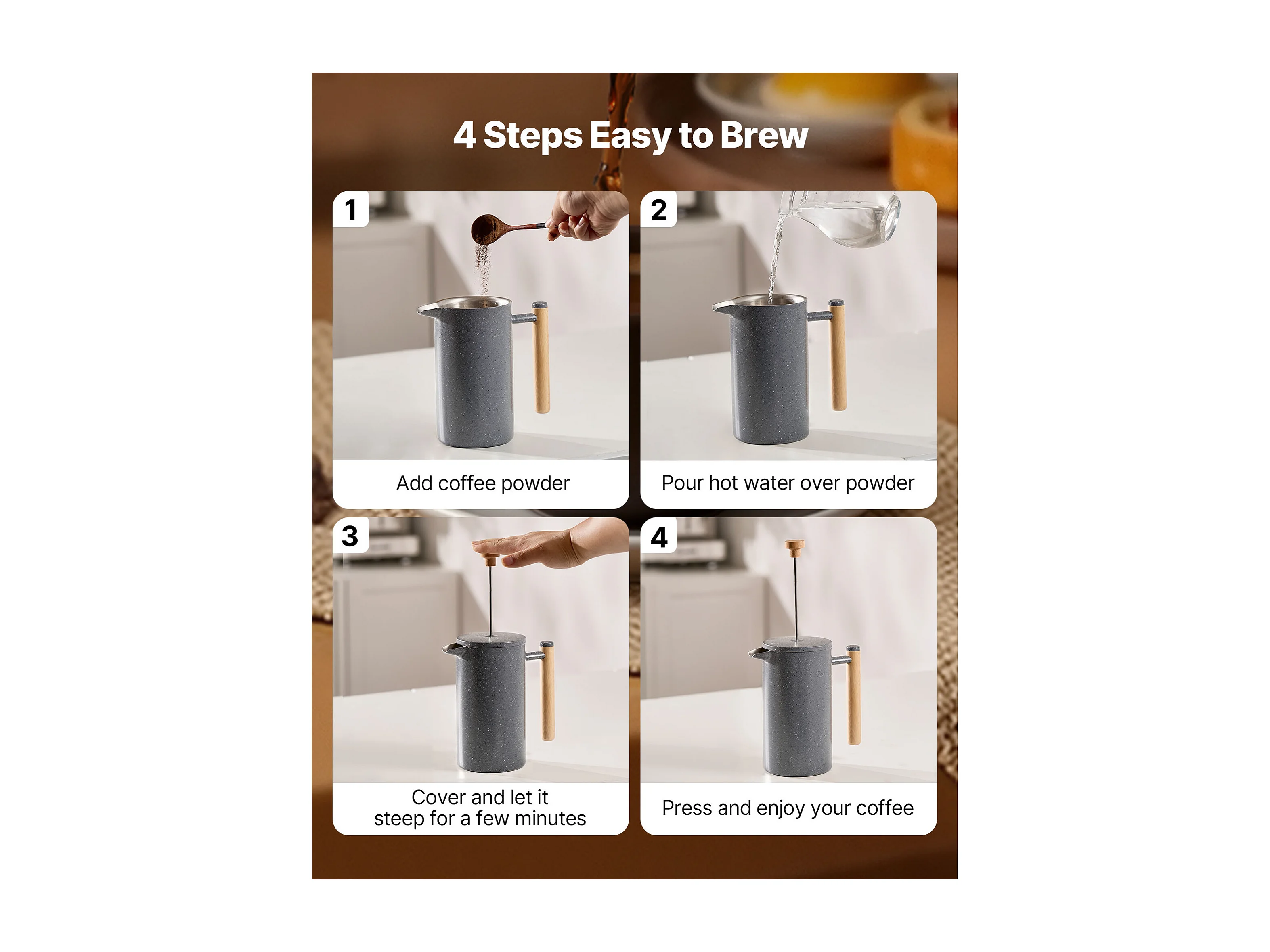 Cafetière à Piston SucceBuy Capacité de 1 L, Presse à Café en Acier Inoxydable avec Filtre, Grande Théière à Piston à Double Paroi Isolée, Infusion à Froid