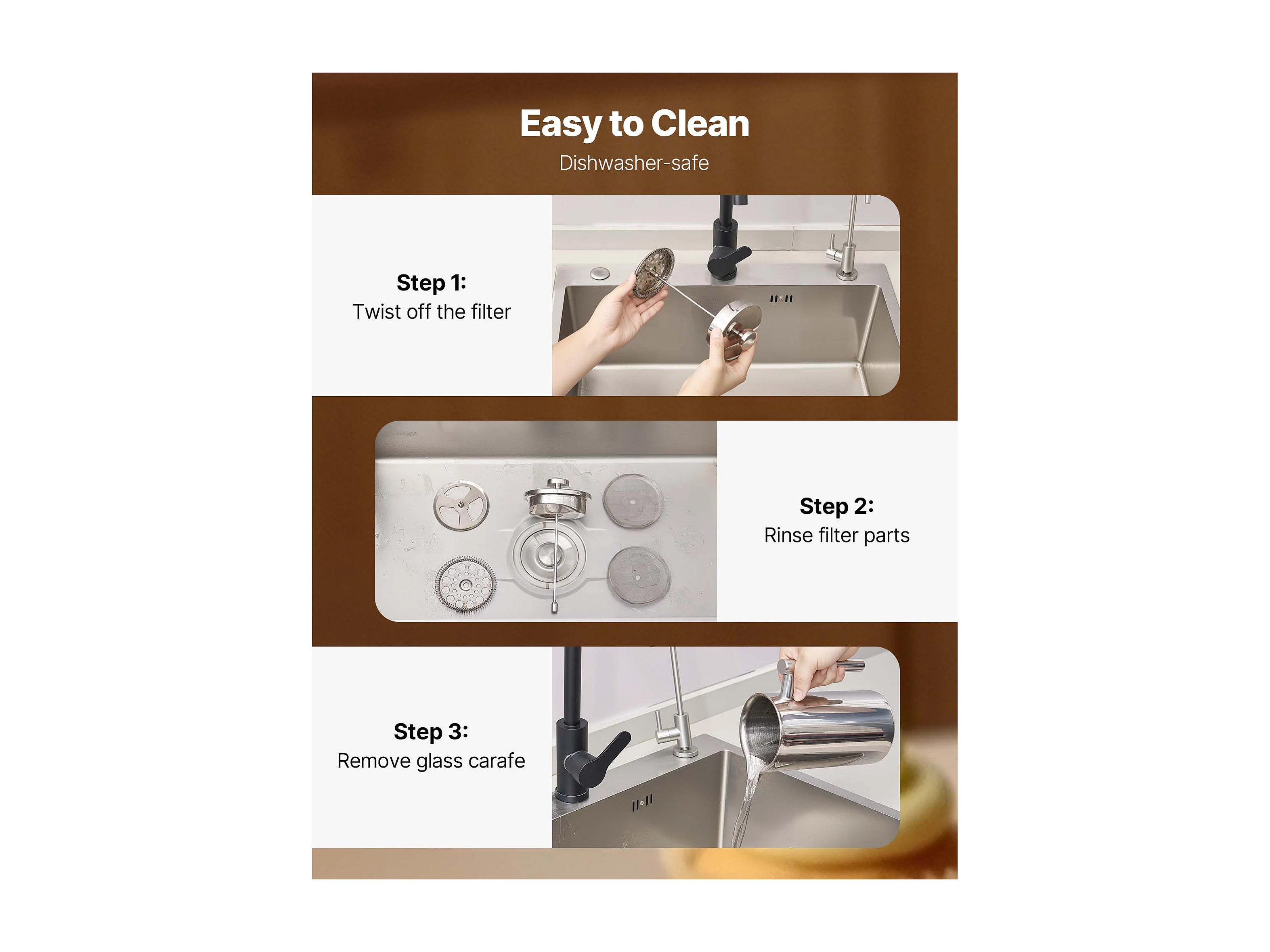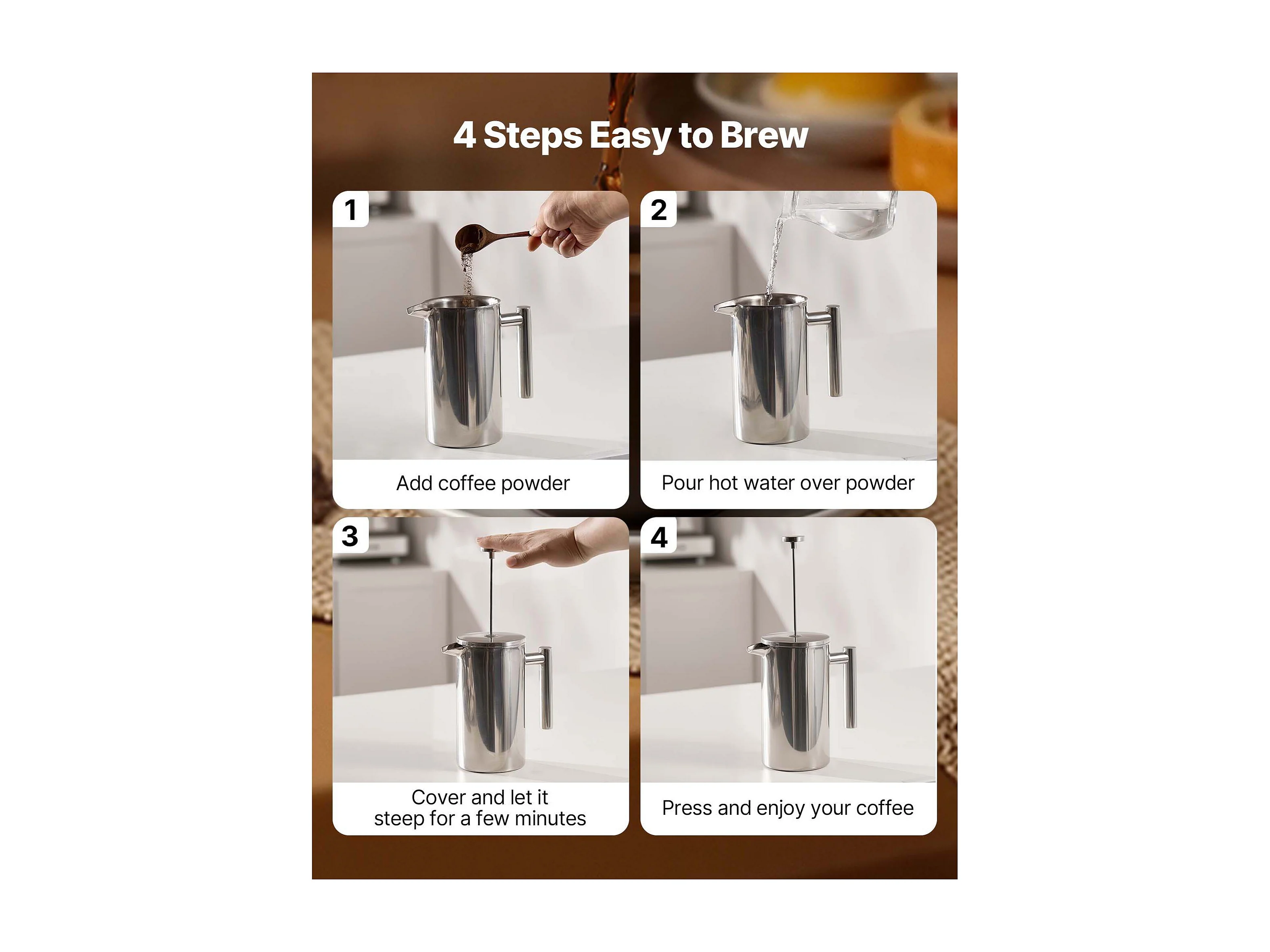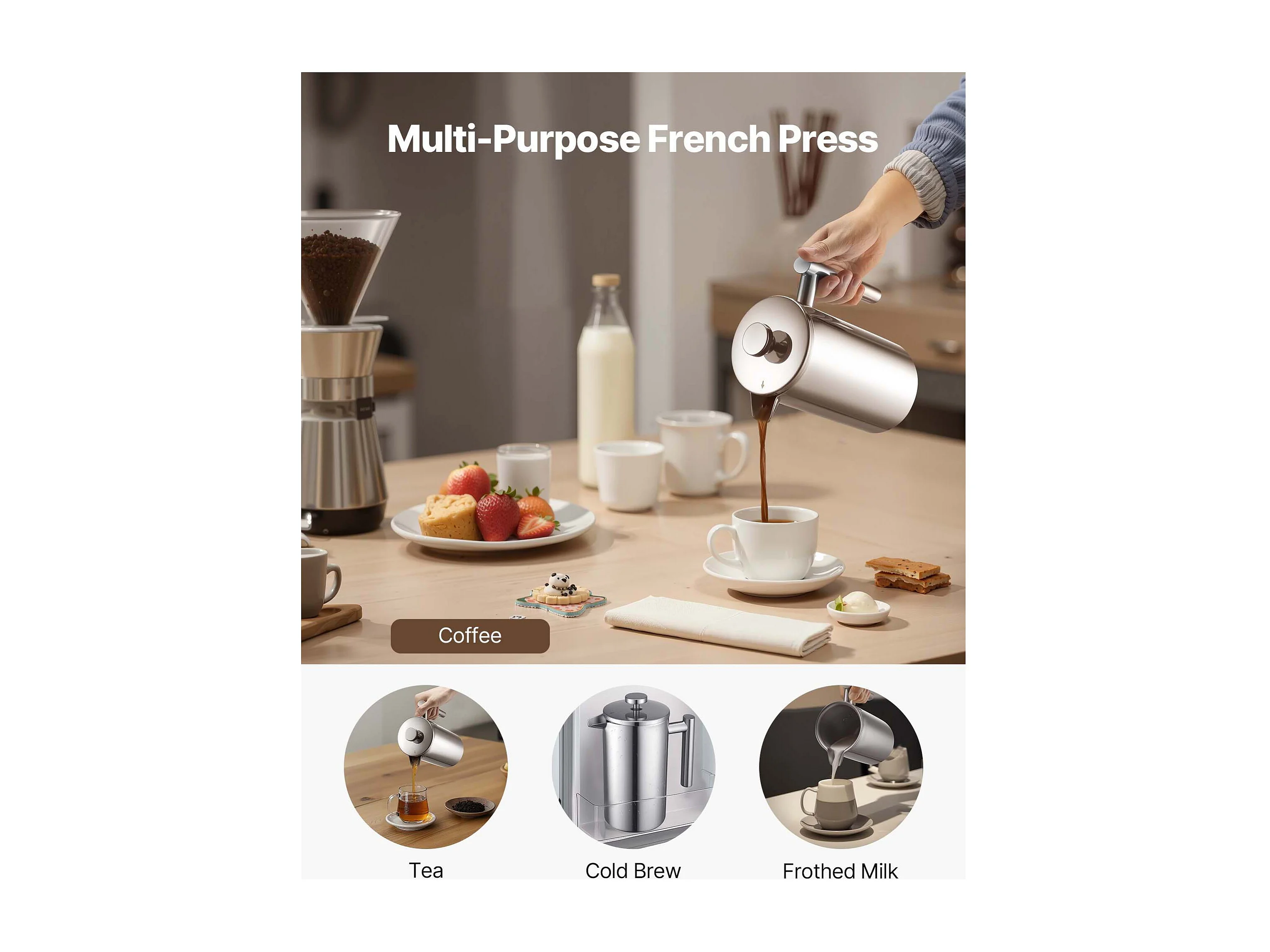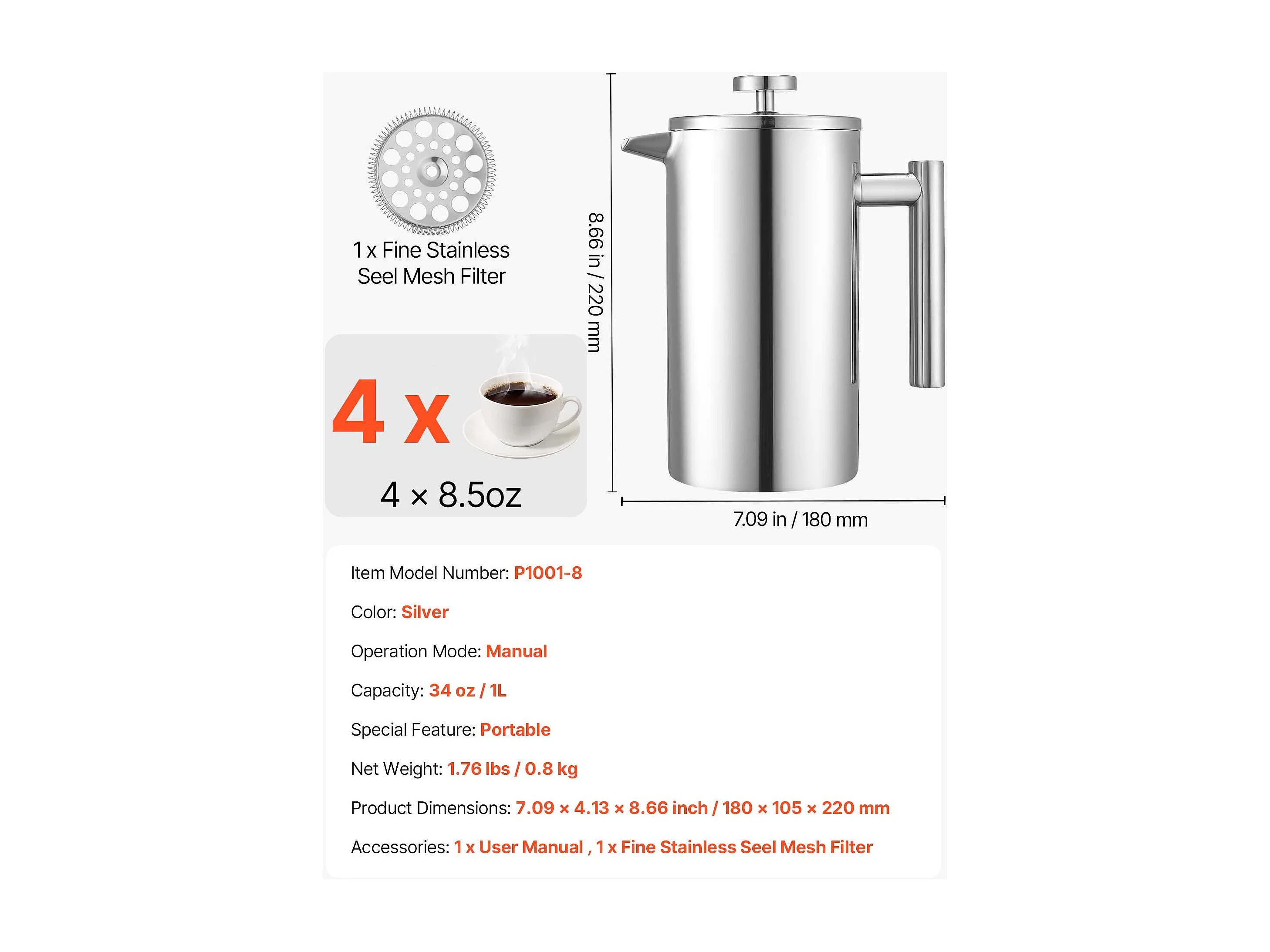 Cafetière à Piston SucceBuy en Acier Inoxydable Capacité 1 L, Presse à Café avec Filtre, Grande Théière à Piston à Double Paroi Isolée, Infusion à Froid