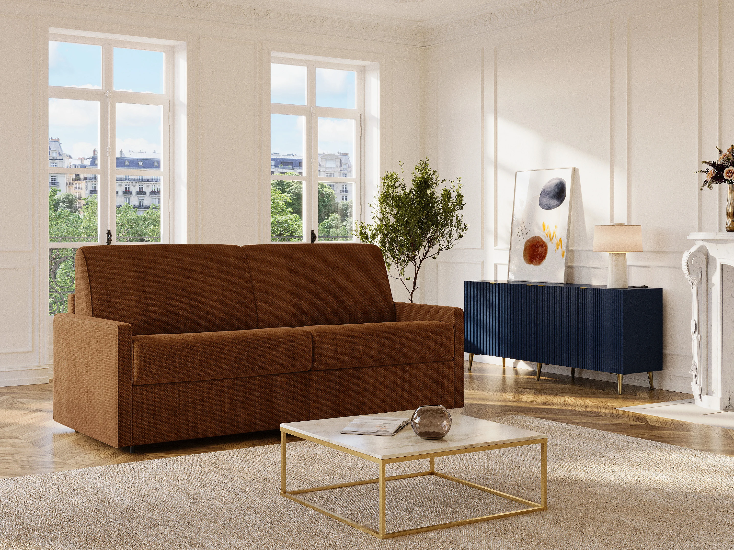 Canapé 2 places convertible express en tissu terracotta - Couchage à lattes larges 120 cm - Matelas 18 cm CALIFE