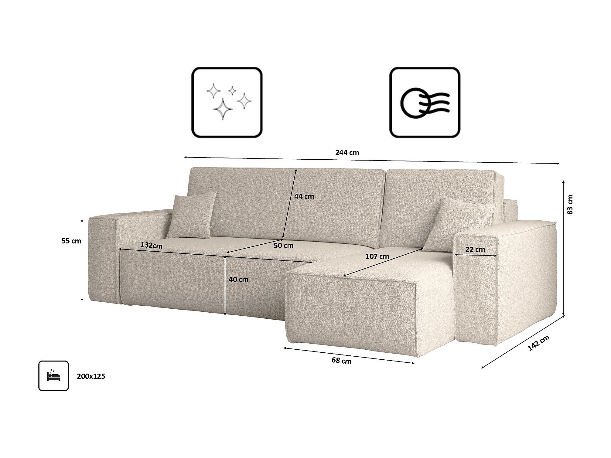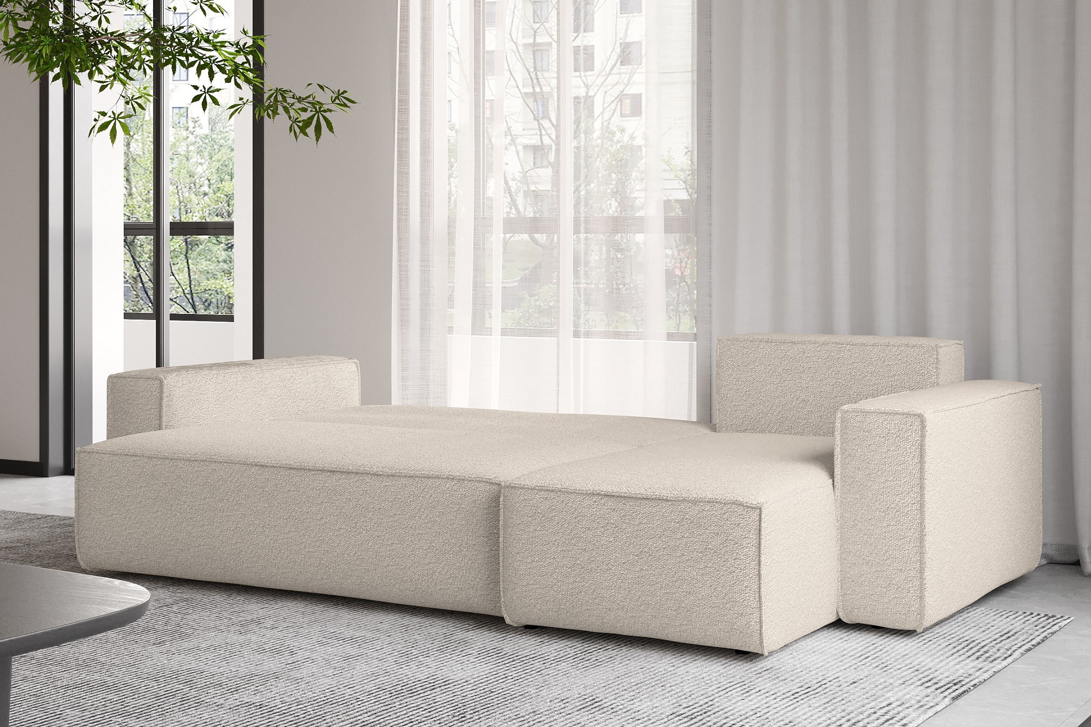 Canapé d'angle avec fonction couchage et coffre de lit, canapé d'angle en L, canapé d'angle en L BEST tissu Abriamo Beige Droite
