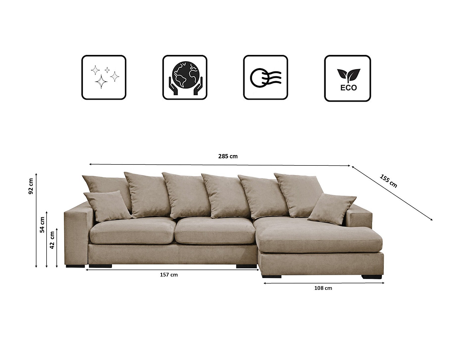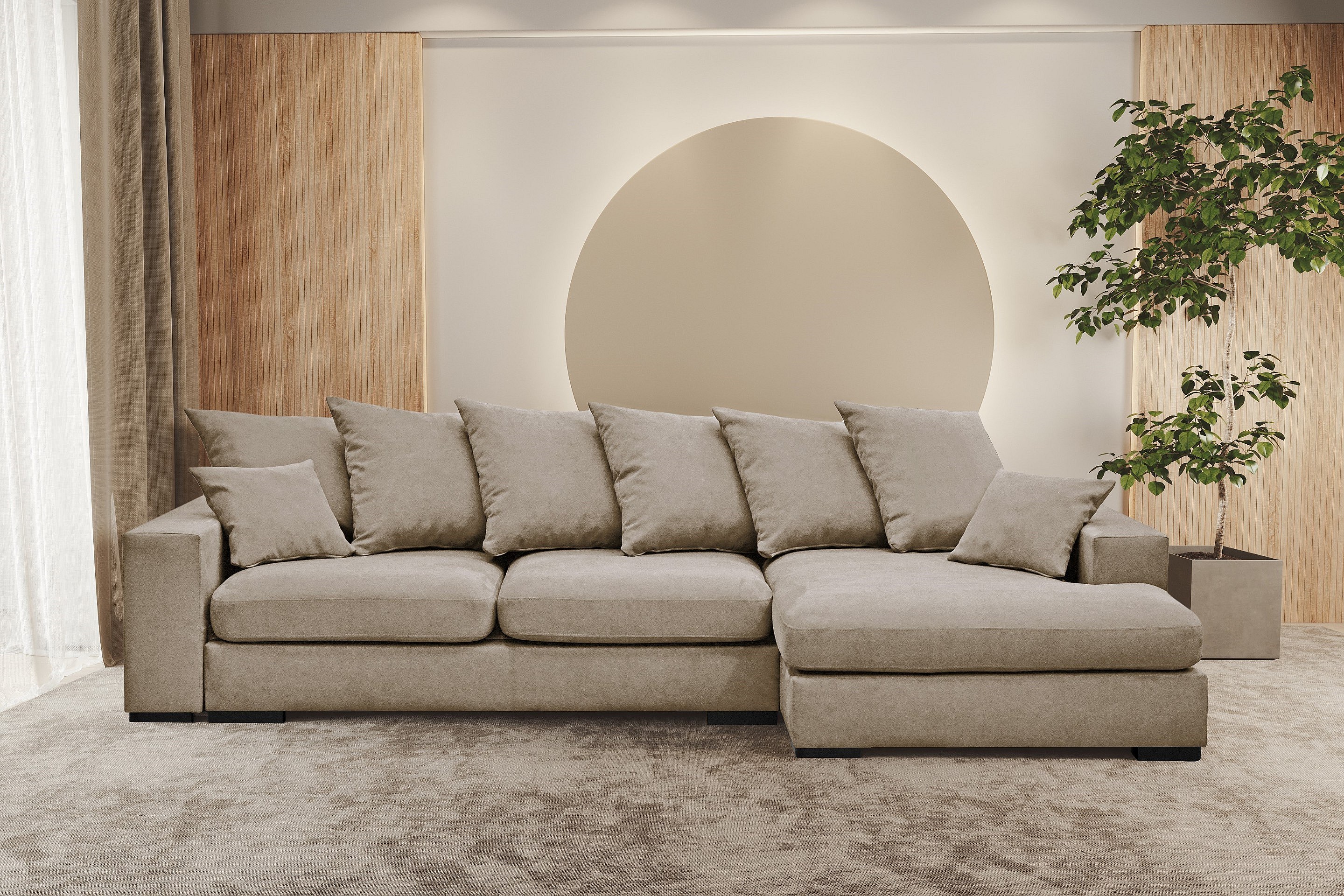 Canapé d'angle avec fonction couchage et coffre de lit, canapé en L, canapé en L tissu Gabon Riviera Droite Beige