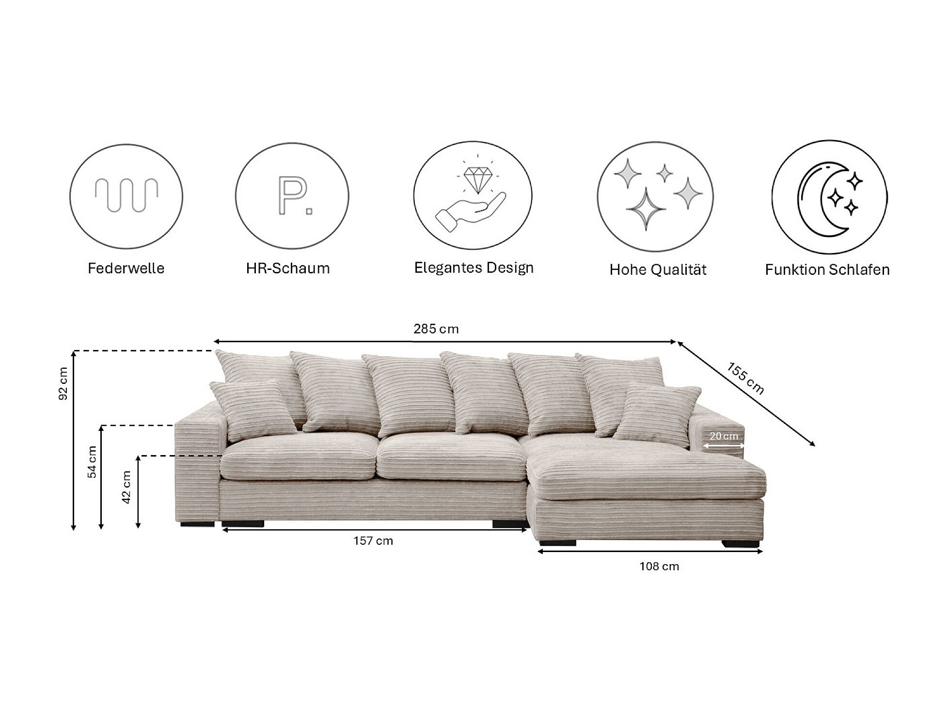 Canapé d'angle avec fonction couchage et coffre de lit, Canapé forme L, Canapé forme L tissu Gabon Zoom Perle Droite