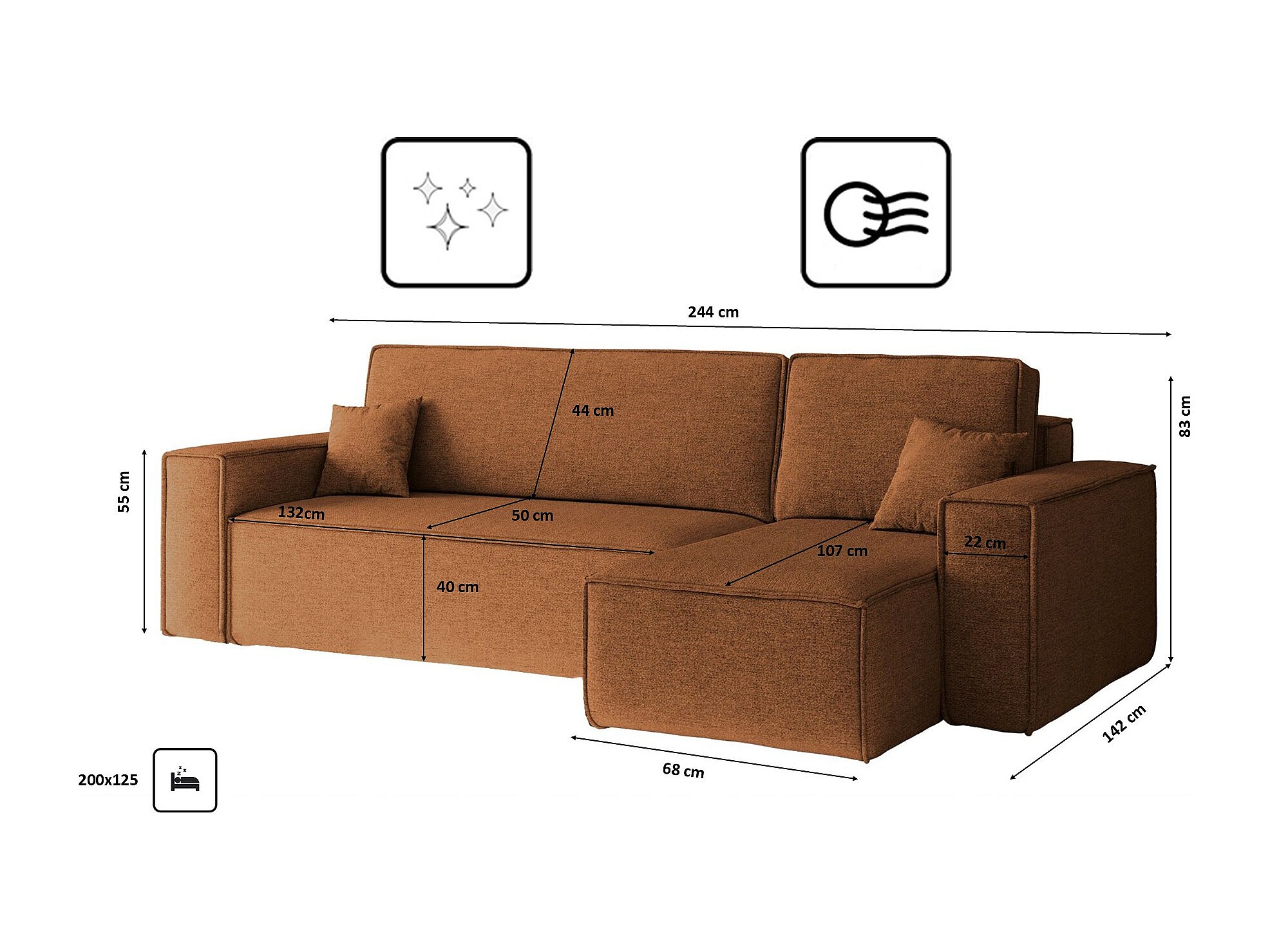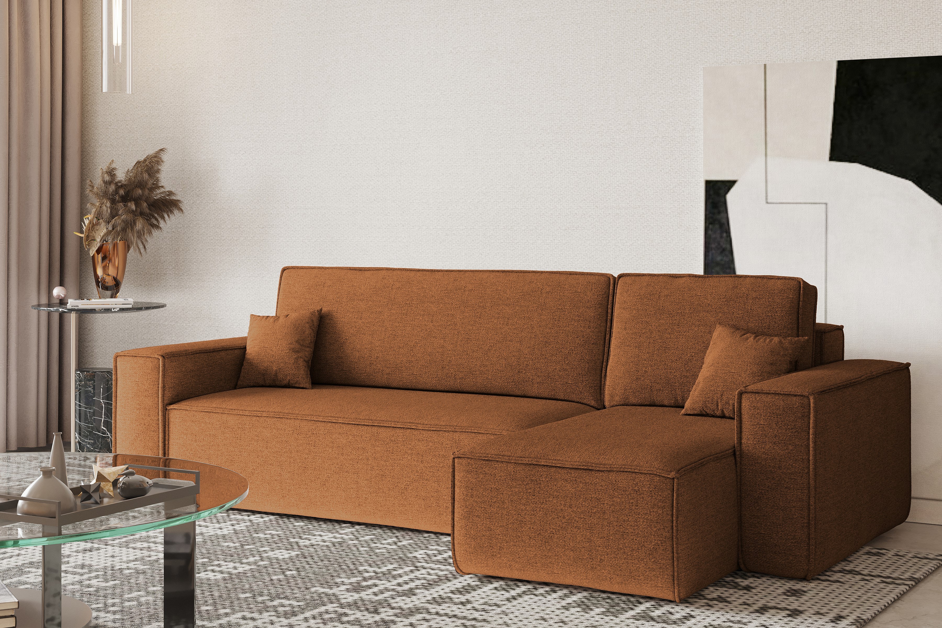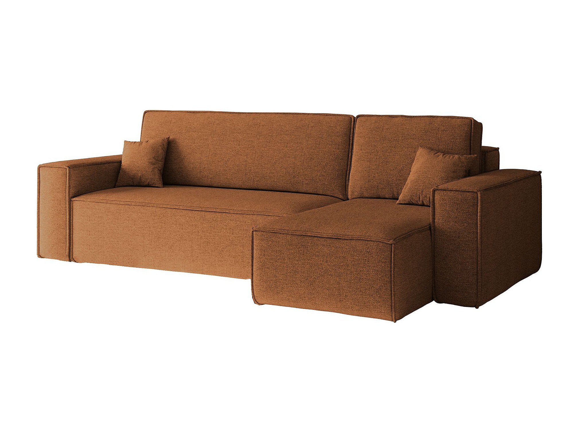 Canapé d'angle Best en L avec fonction couchage et coffre de lit, tissu Neve, cuivre, droit