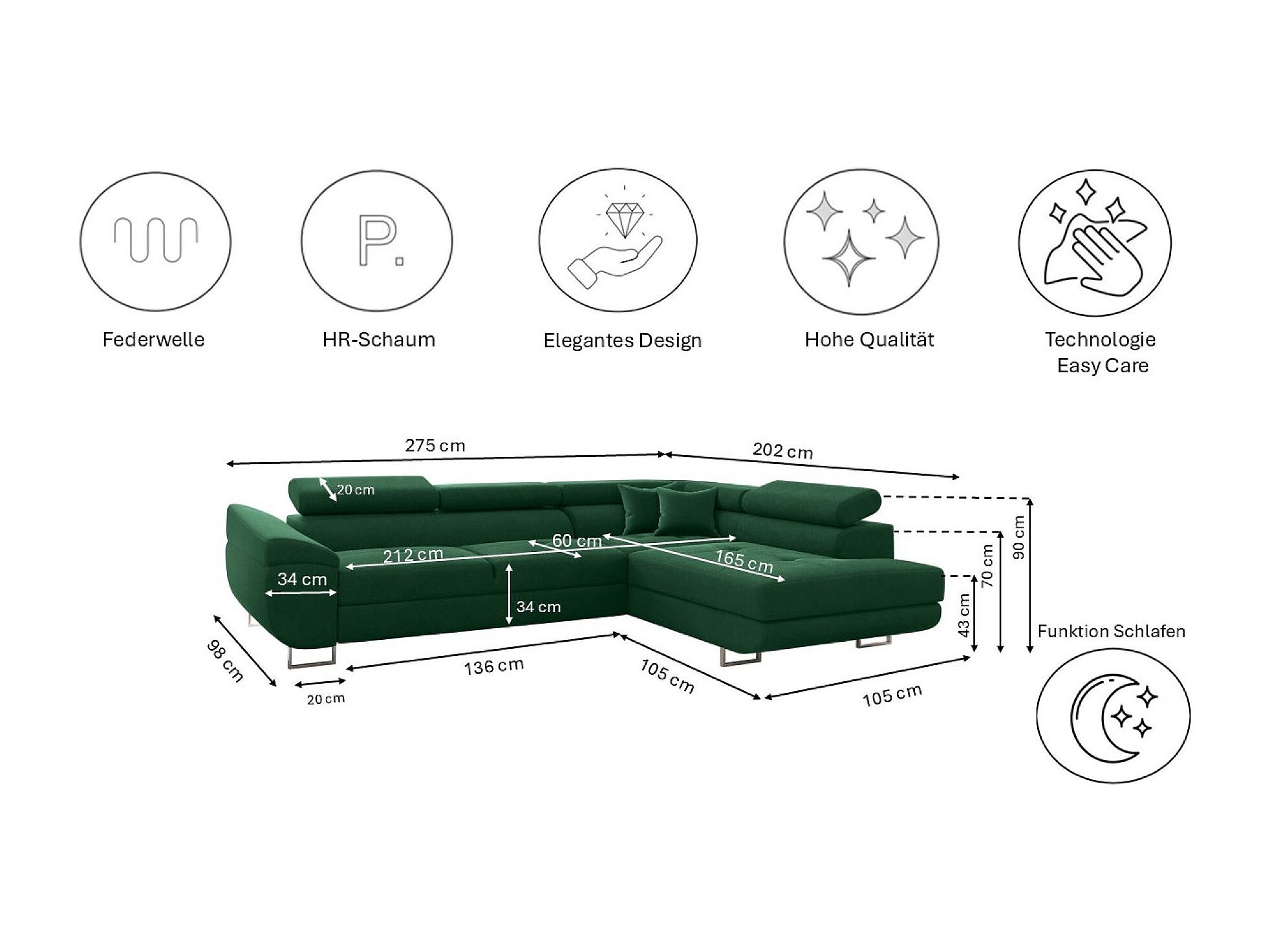 Canapé d'angle en L FALIO avec fonction couchage, tissu Noel, vert foncé, droite