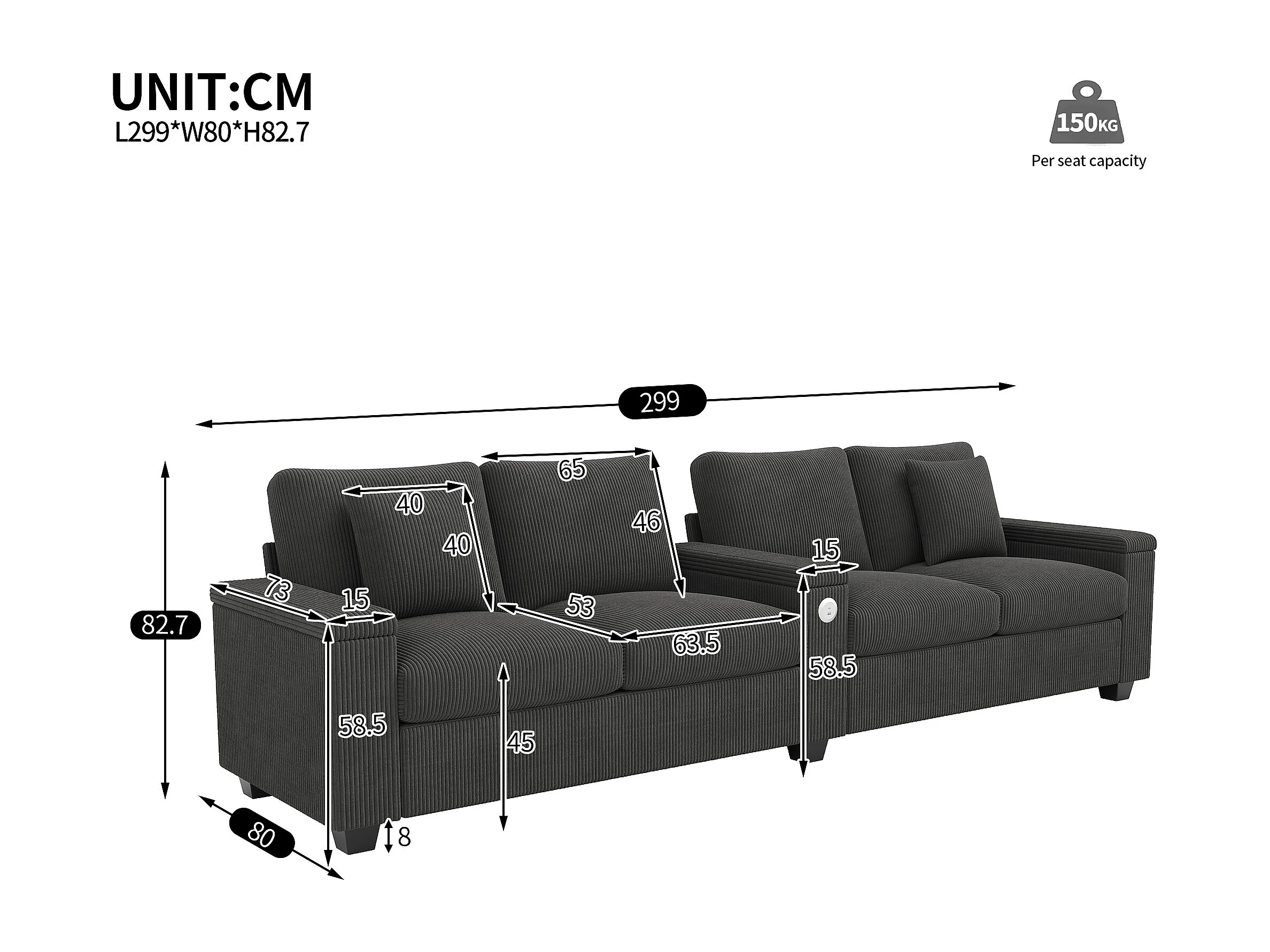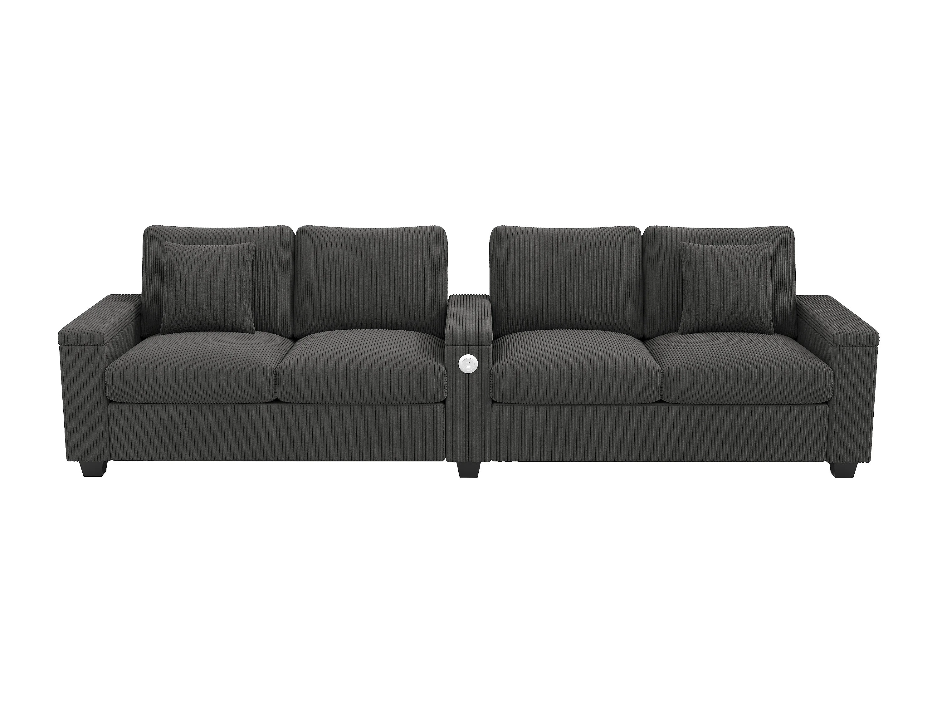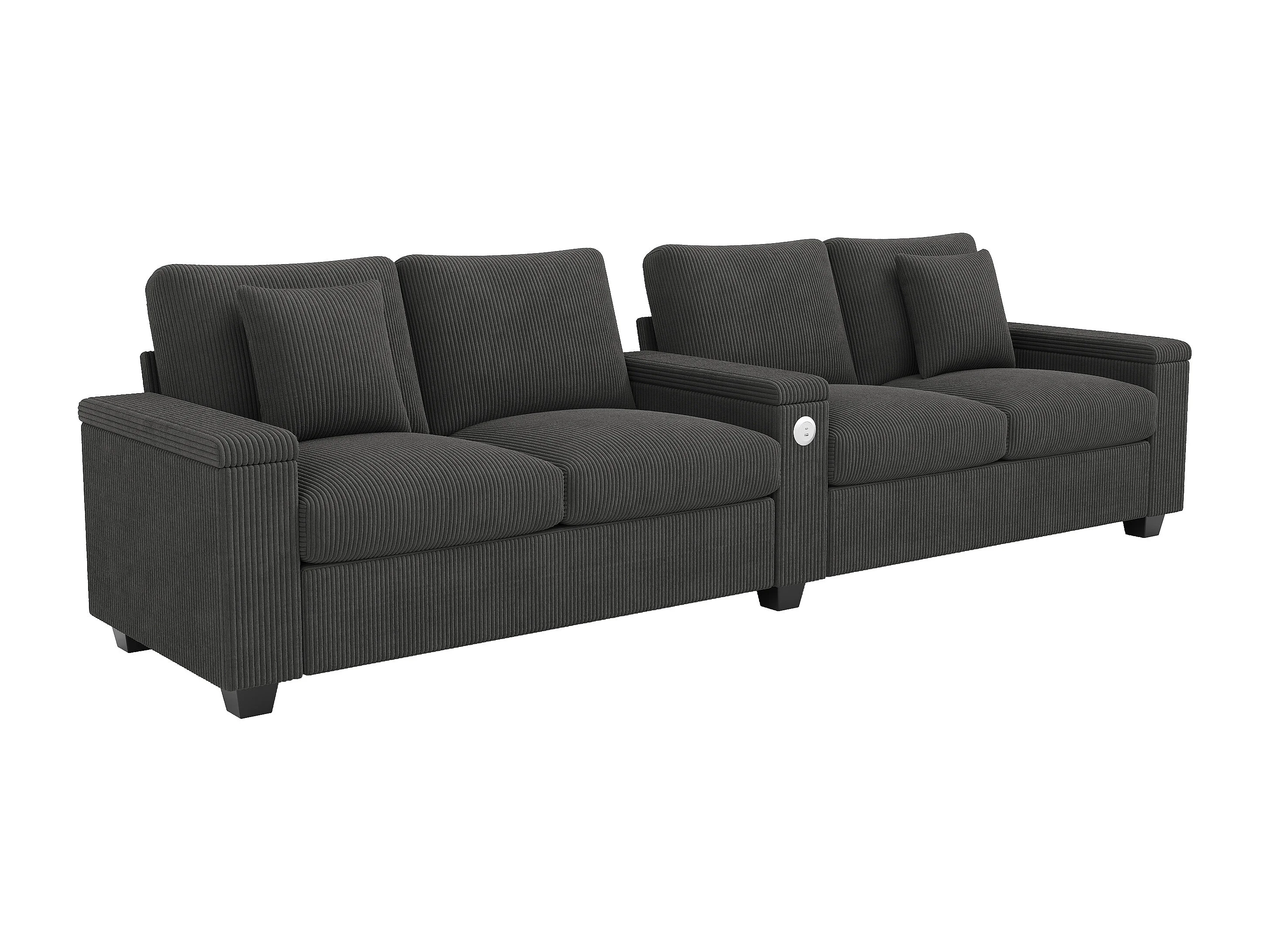 Canapé moderne 4 places - avec accoudoir central pliable - avec ports de chargement USB/USB-C - Velours côtelé - gris