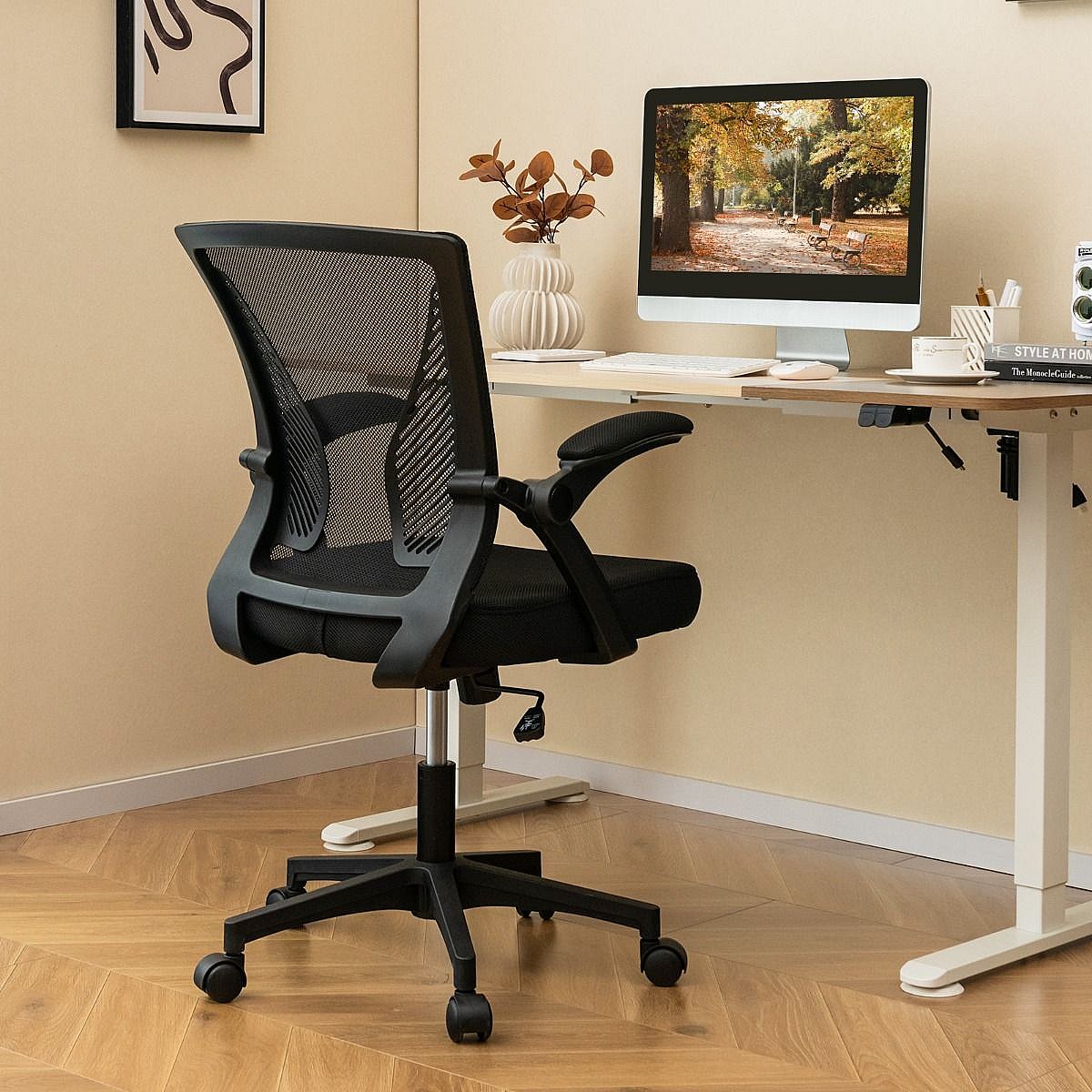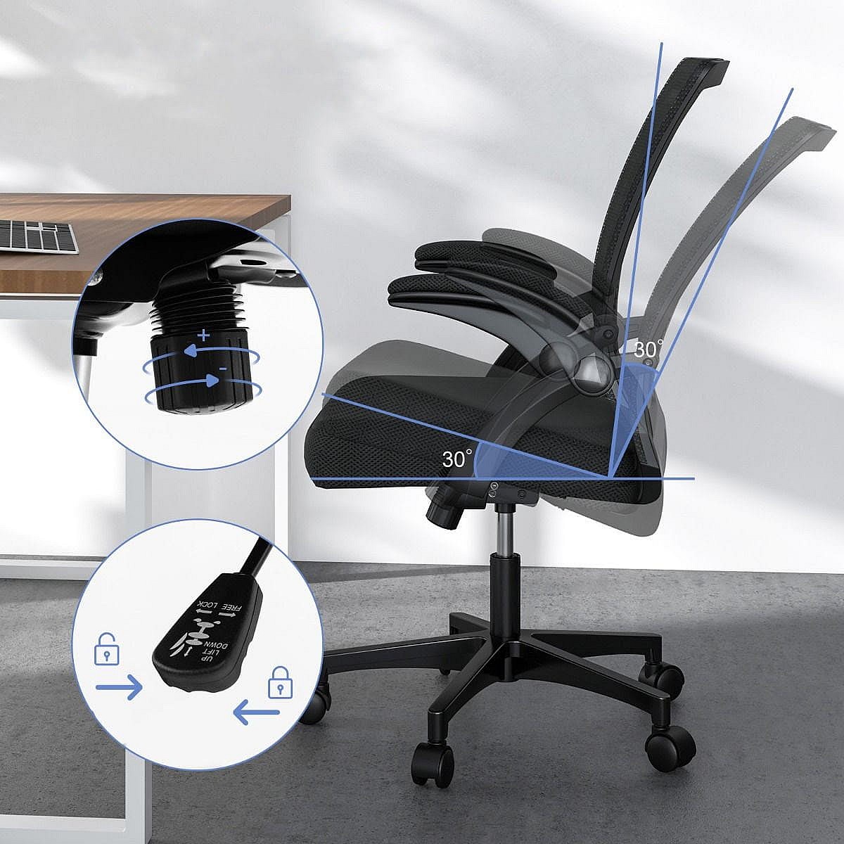 Chaise de Bureau Ergonomique Chaise de Travail Pivotante Réglable avec Accoudoirs Rabattables Dossier à Bascule à 30° Noir