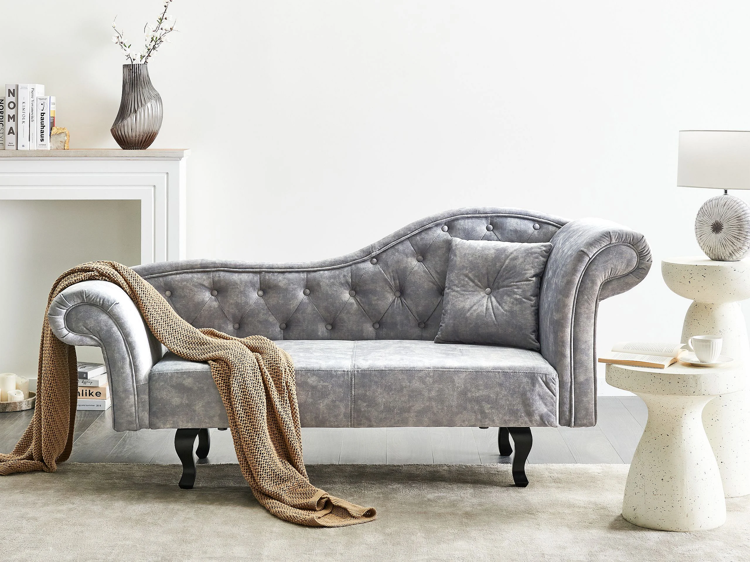 Chaise longue côté droit LATTES II Velours Gris avec coussin