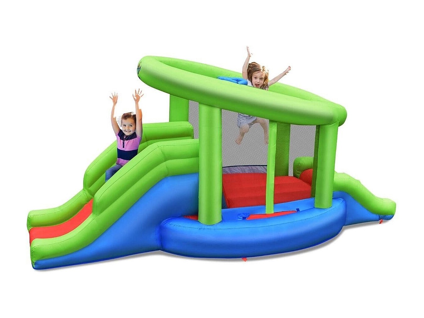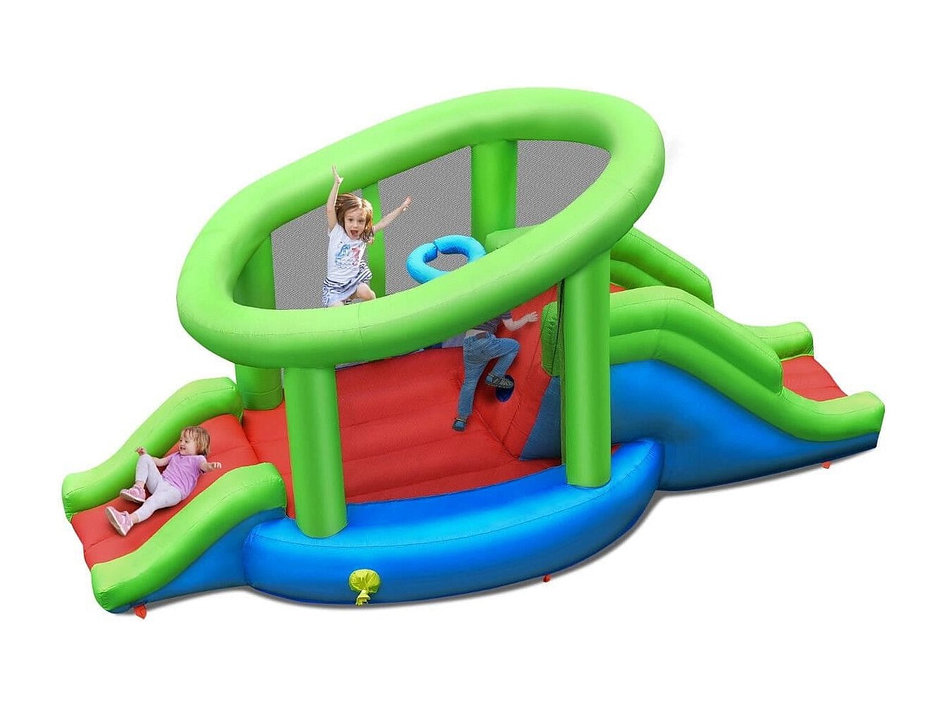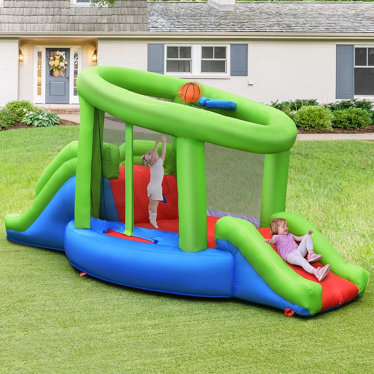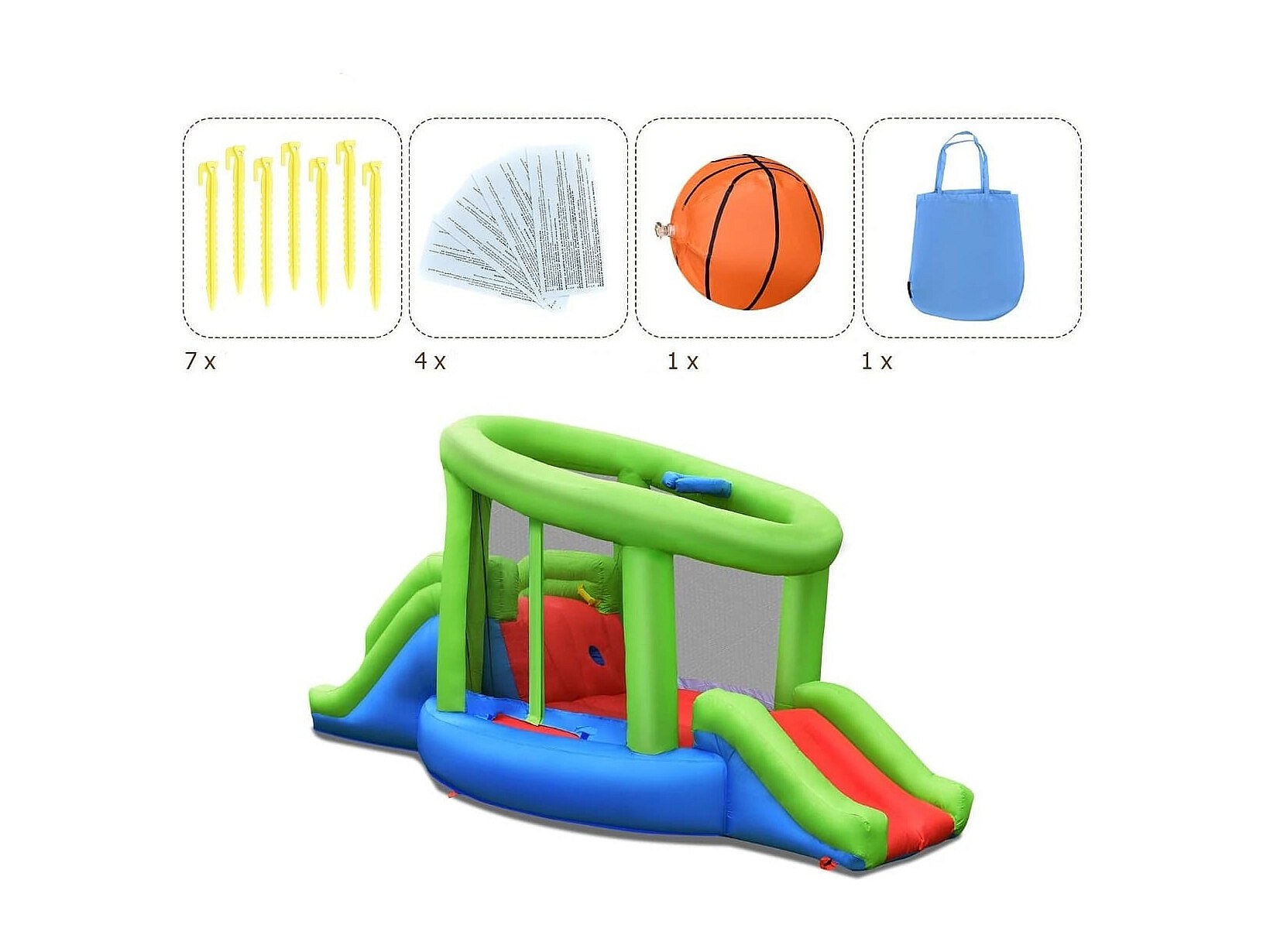 Château gonflable avec toboggan, zone de saut, panier et compresseur, jeu gonflable pour enfants d’extérieur