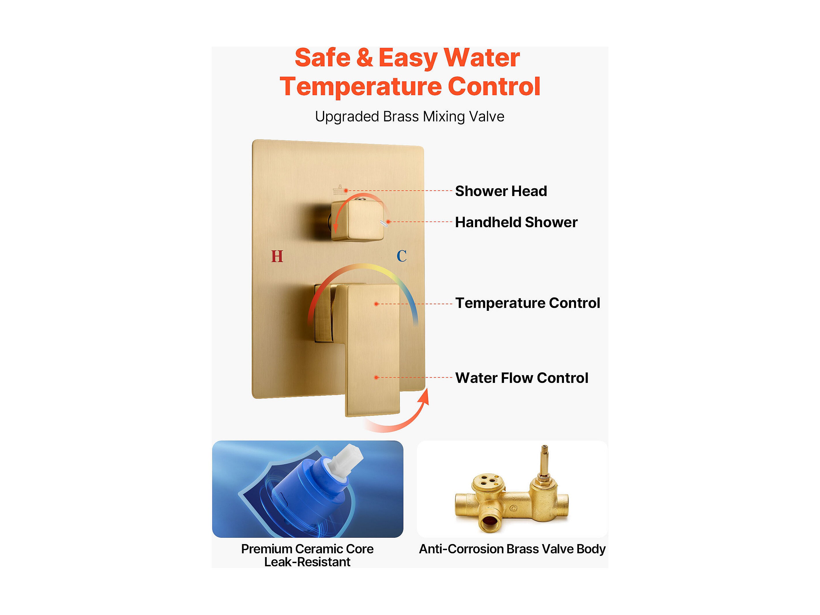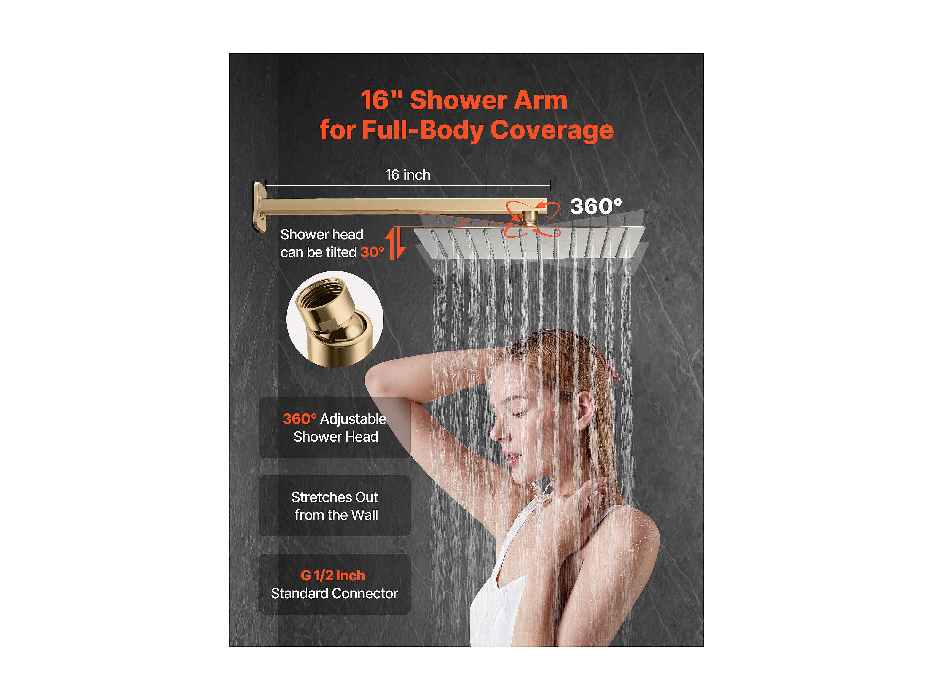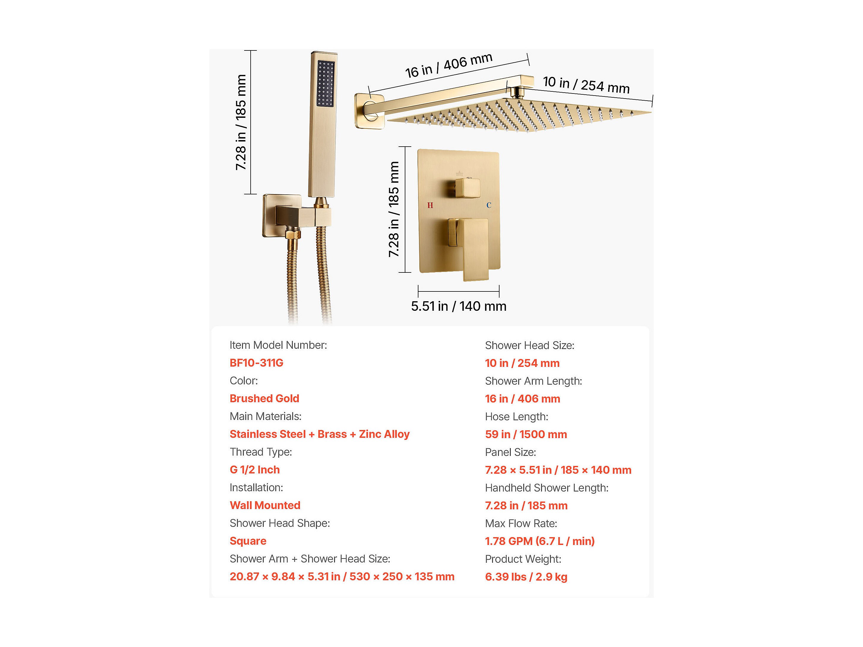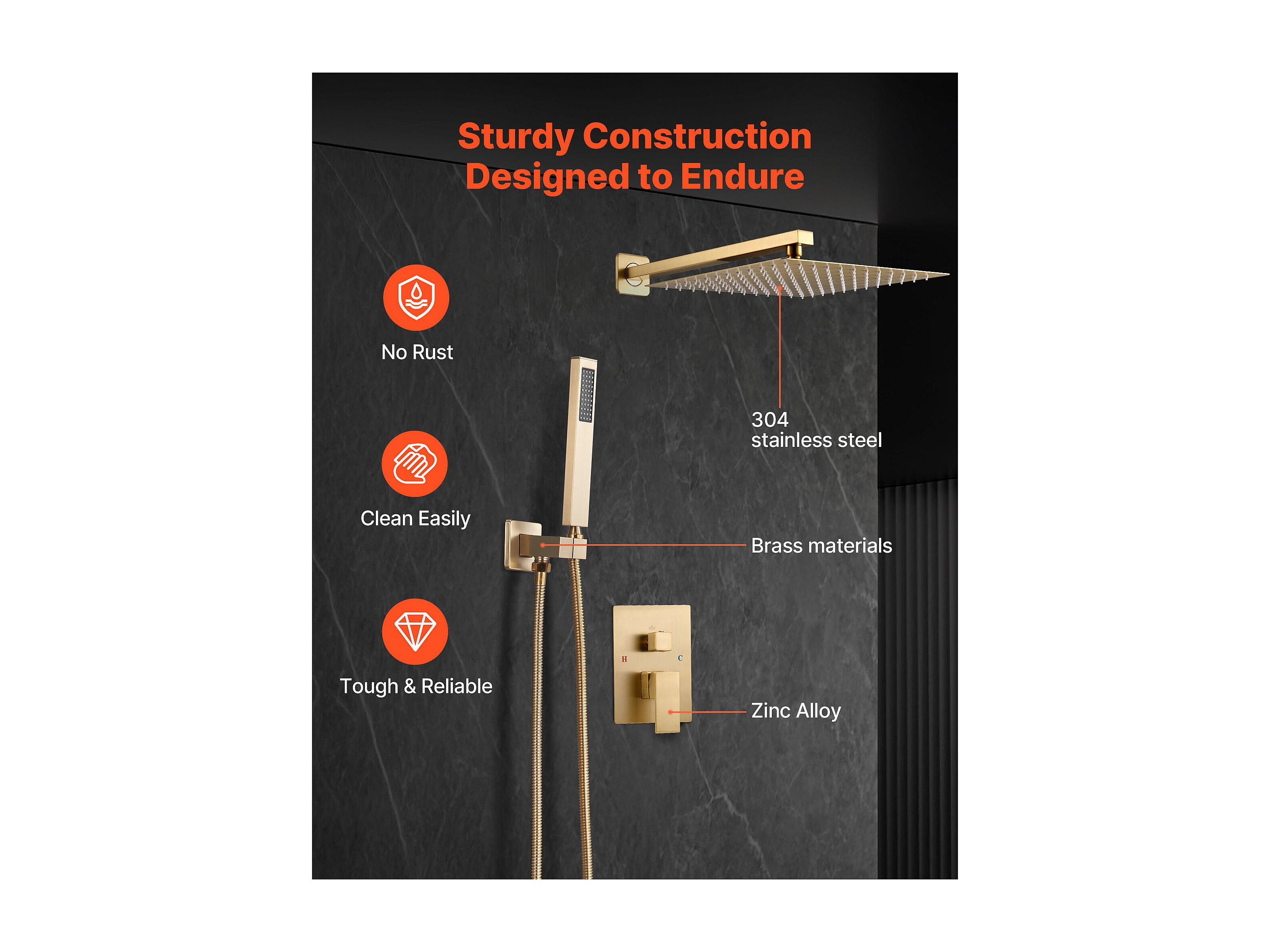 Colonne de Douche SucceBuy Ensemble de Douche avec Pommeau de Douche Carré Effet Pluie de 254 mm et Douchette à Main, Ensemble de Douche Mural, Or Brossé