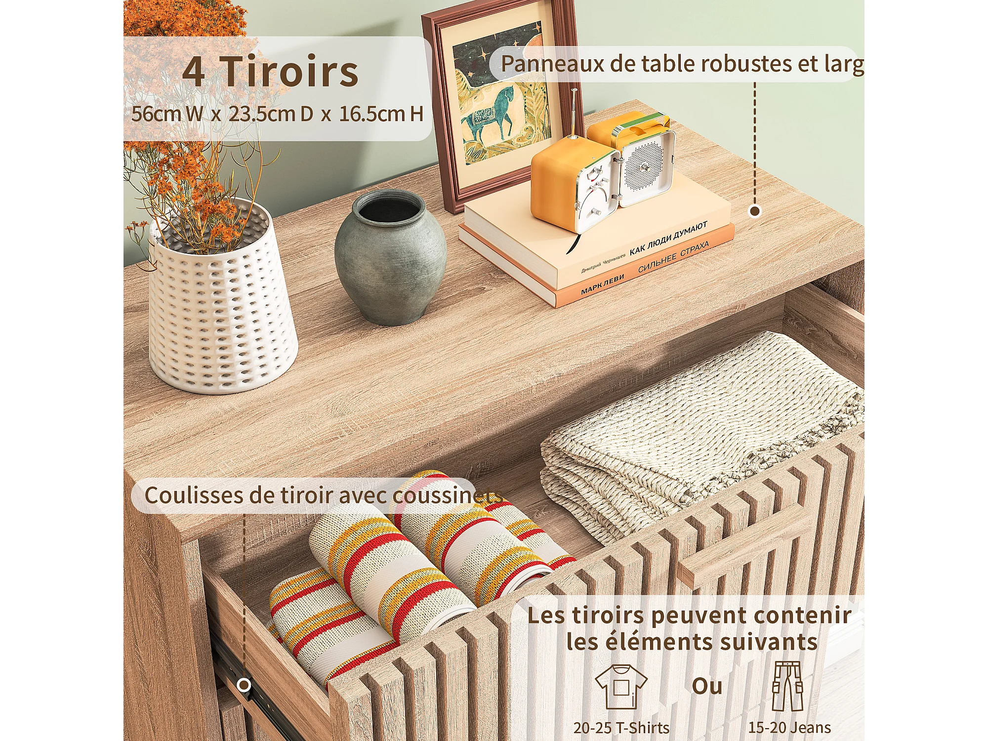 Commode 4 tiroirs, Commode Chambre 60 cm Largeur, Meuble de Rangement en Bois Effet cannelé