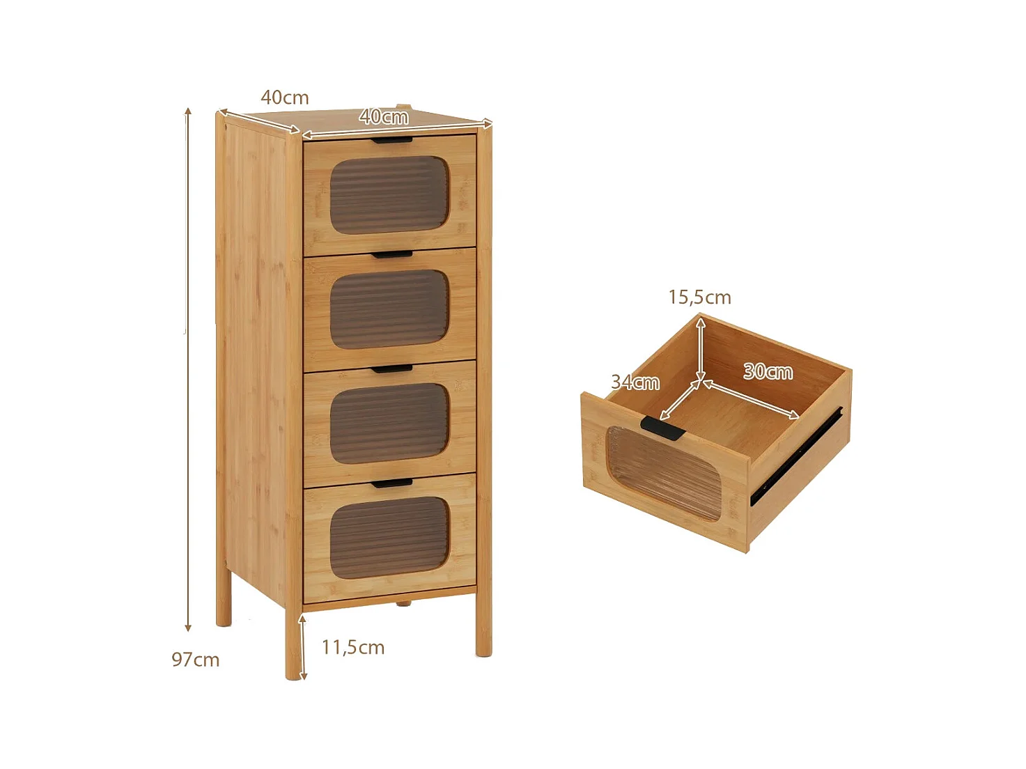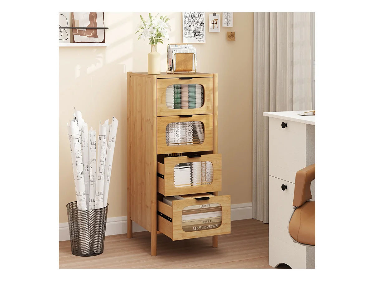 Commode à 4 Tiroirs Armoire de Rangement en Bambou avec Tiroirs en Verre Trempé Rayé Meuble de Rangement de Style Moderne Naturel