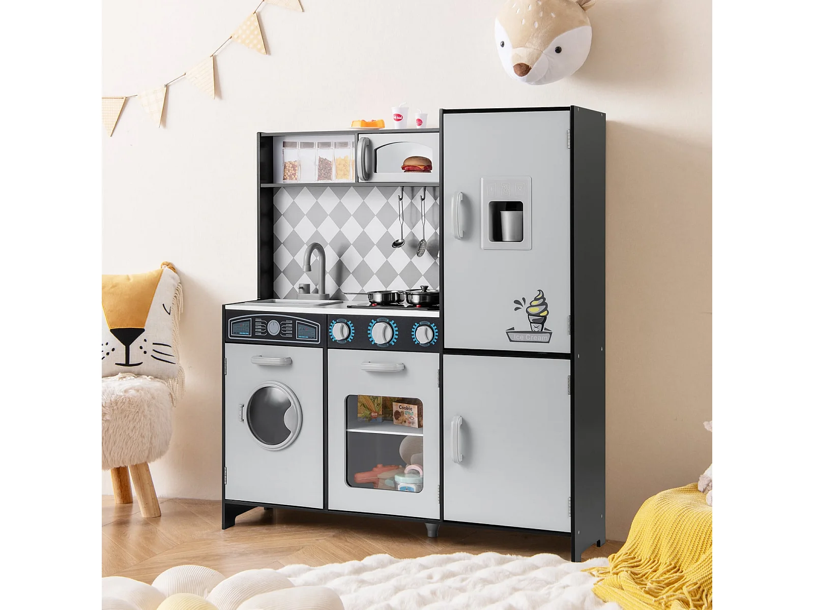 Cuisine de Jeu pour Enfants de 3+ Ans Jouets en Bois Machine à Glaçons Cuisinière Machine à Laver Four Micro-ondes Ustensiles Sons Gris