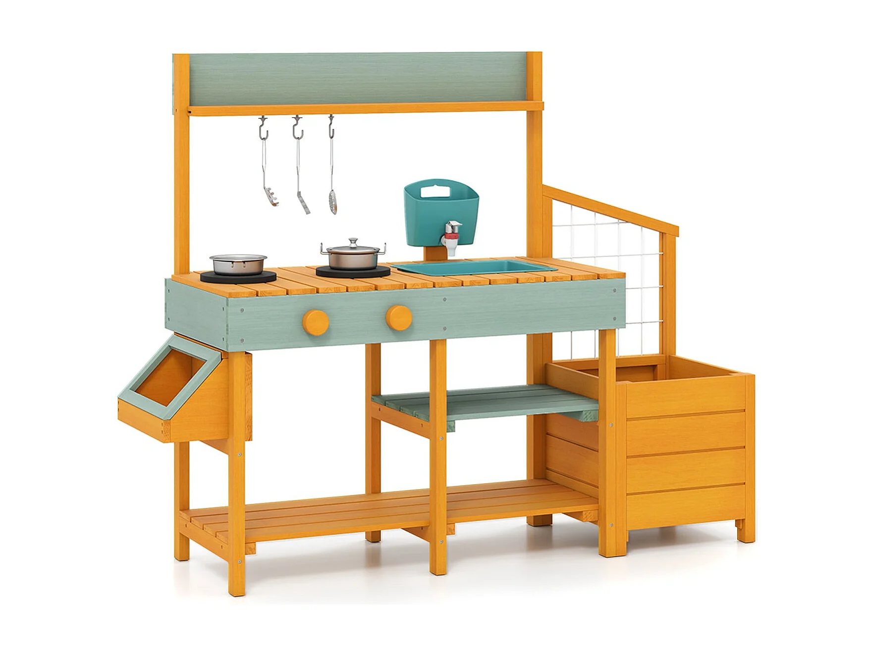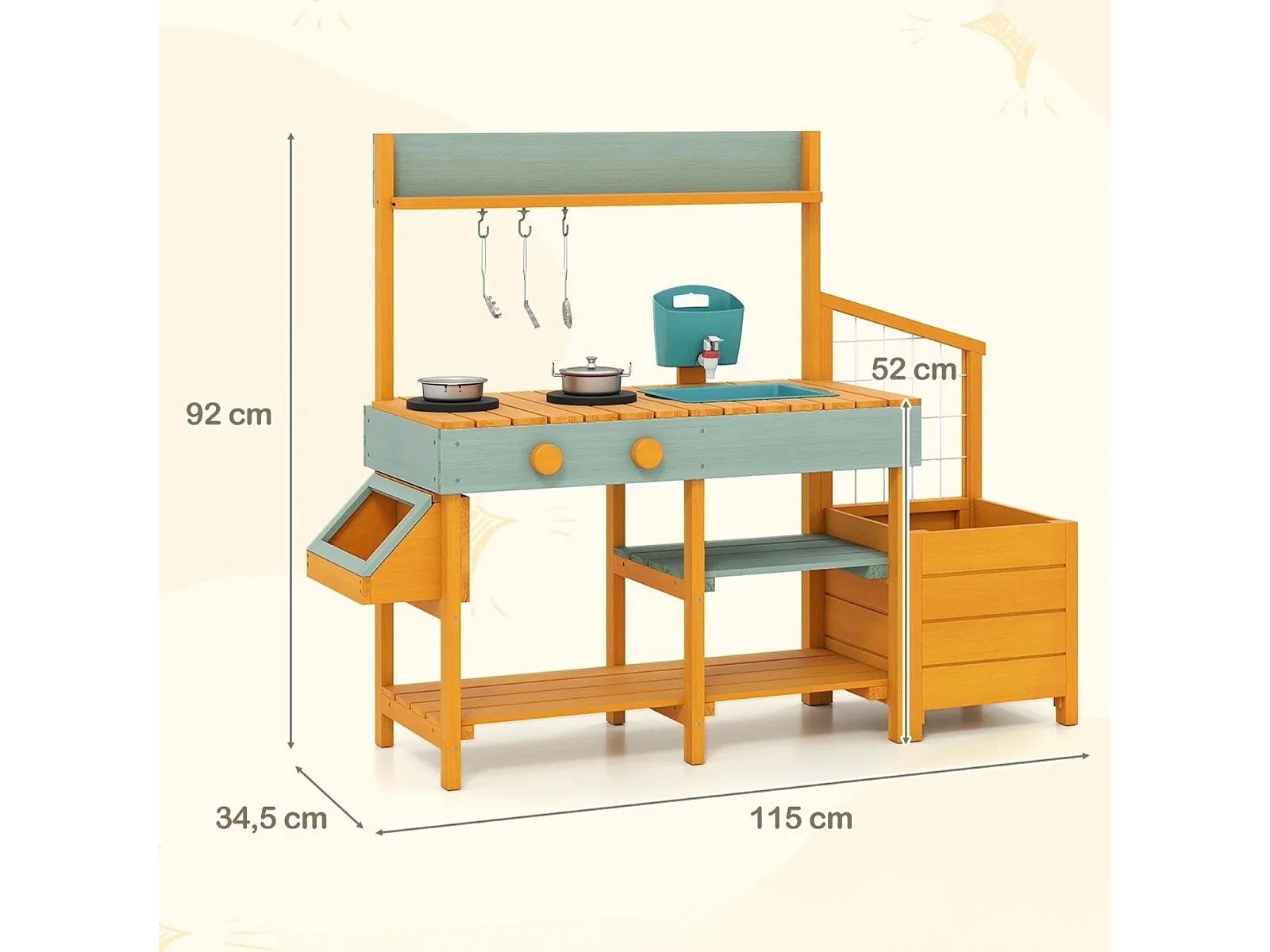 Cuisine d'Extérieur en Bois pour Enfants avec Bac à Plantes Évier Amovible Robinet Plaques de Cuisson Bac à Eau & Étagères pour 3-8 Ans Café