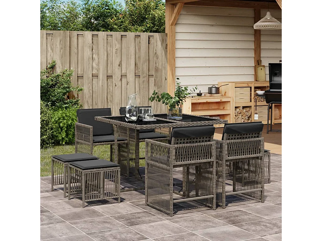 Ensemble à manger de jardin 9 pcs coussins gris résine tressée