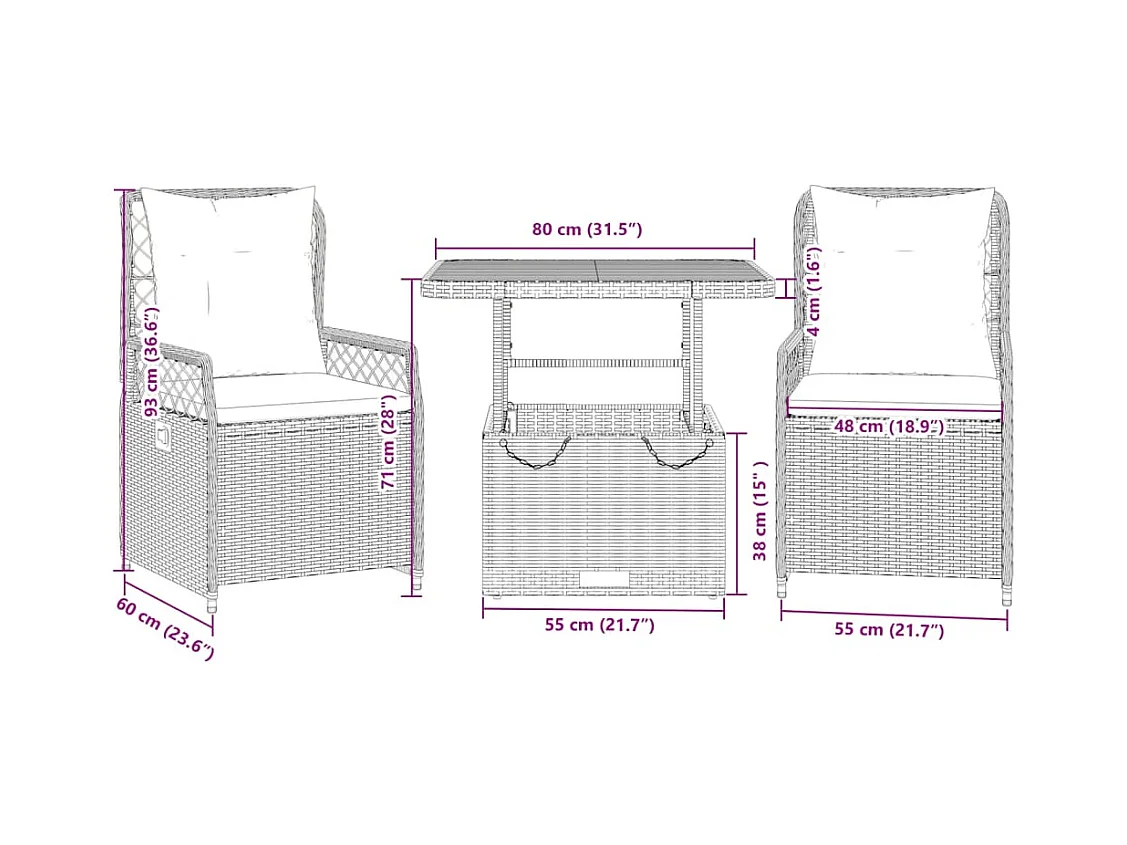 Ensemble de bistro 3 pcs avec coussins noir résine tressée