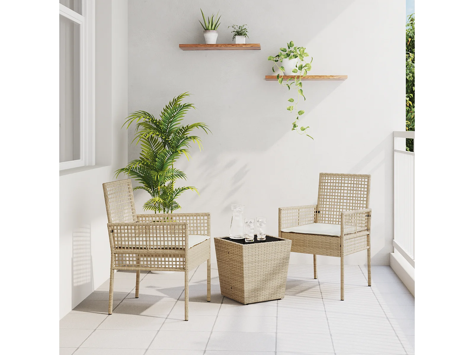 Ensemble Bistro de Jardin 3 Pièces avec Coussins Beige en Poly Rattan