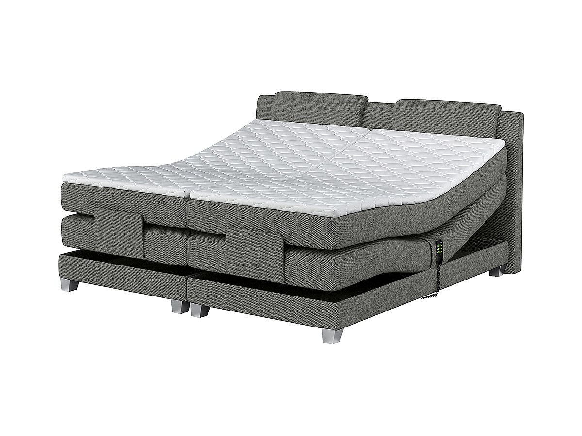 L'ensemble boxspring CASTEL en tissu offre une solution complète esthétique et haut de gamme : sommiers déco ressorts électrique : tête et pieds relevables pour plus de confort et de praticité (8 pieds inclus), matelas déco ressorts ensachés, surmatelas mousse et tête de lit assortie !