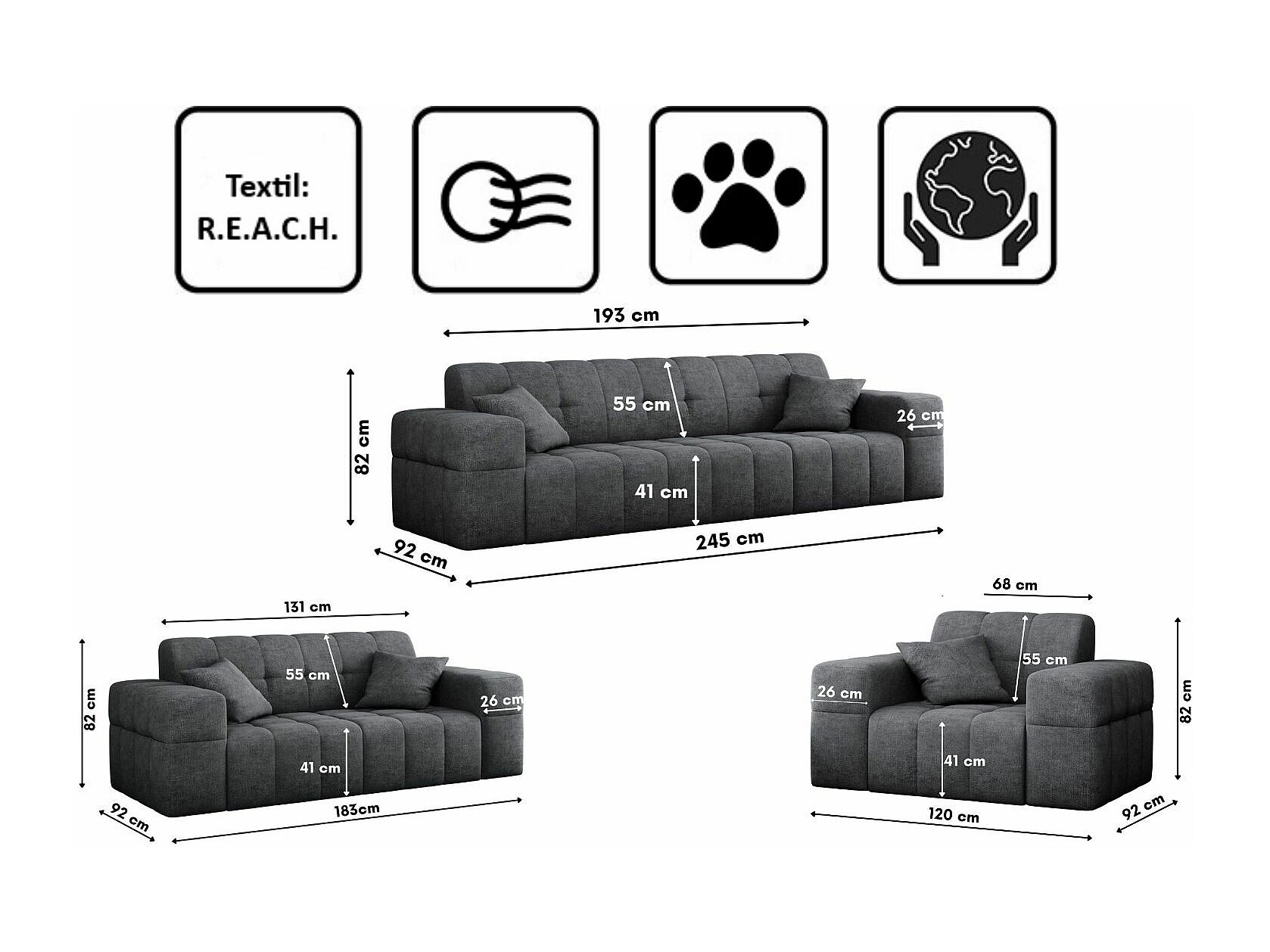 Ensemble de canapés 3+2+1 série NIMES tissu élégant Perfect Harmony gris foncé