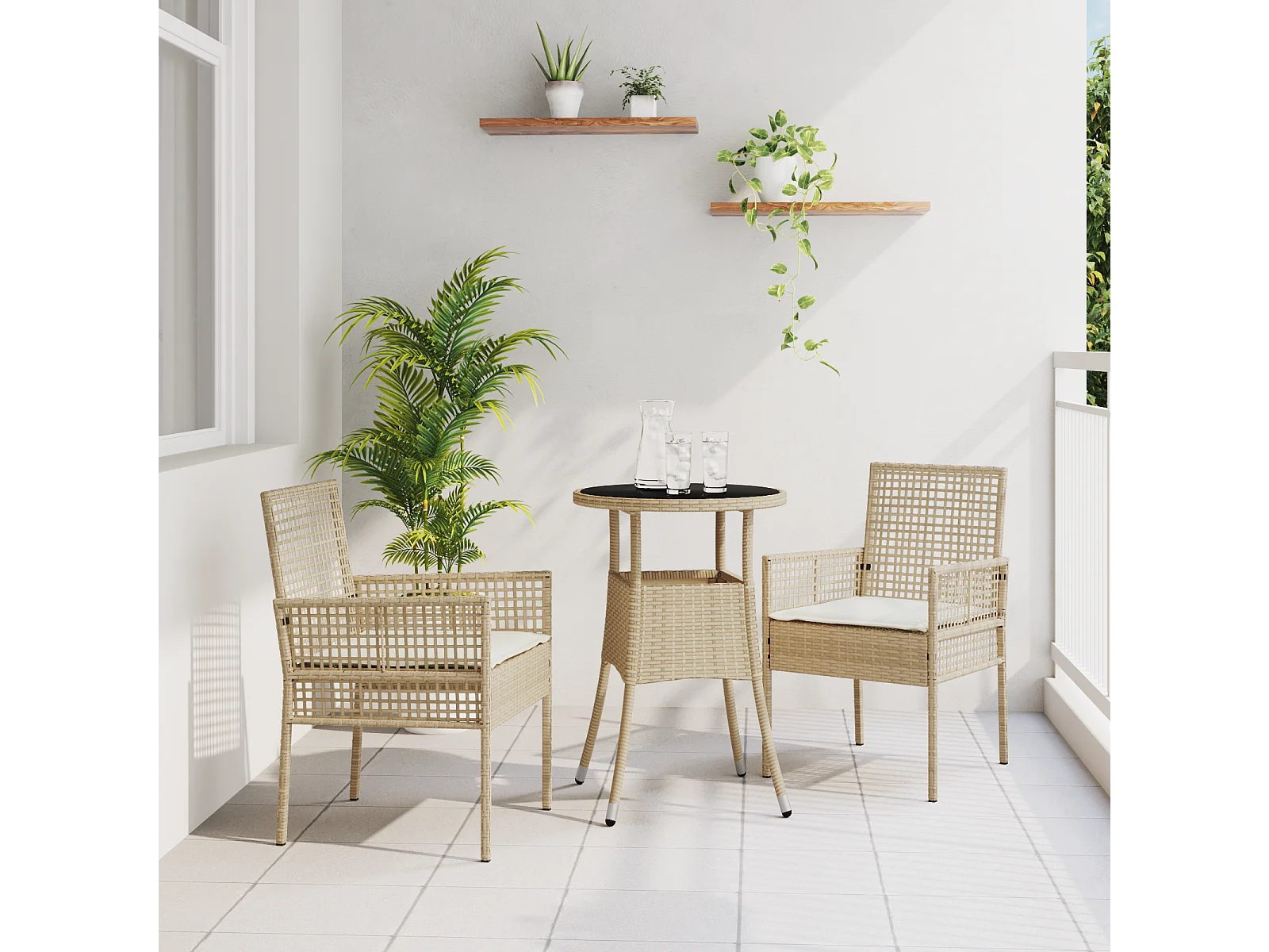 Ensemble Bistro de Jardin 3 Pièces avec Coussins Beige en Poly Rattan