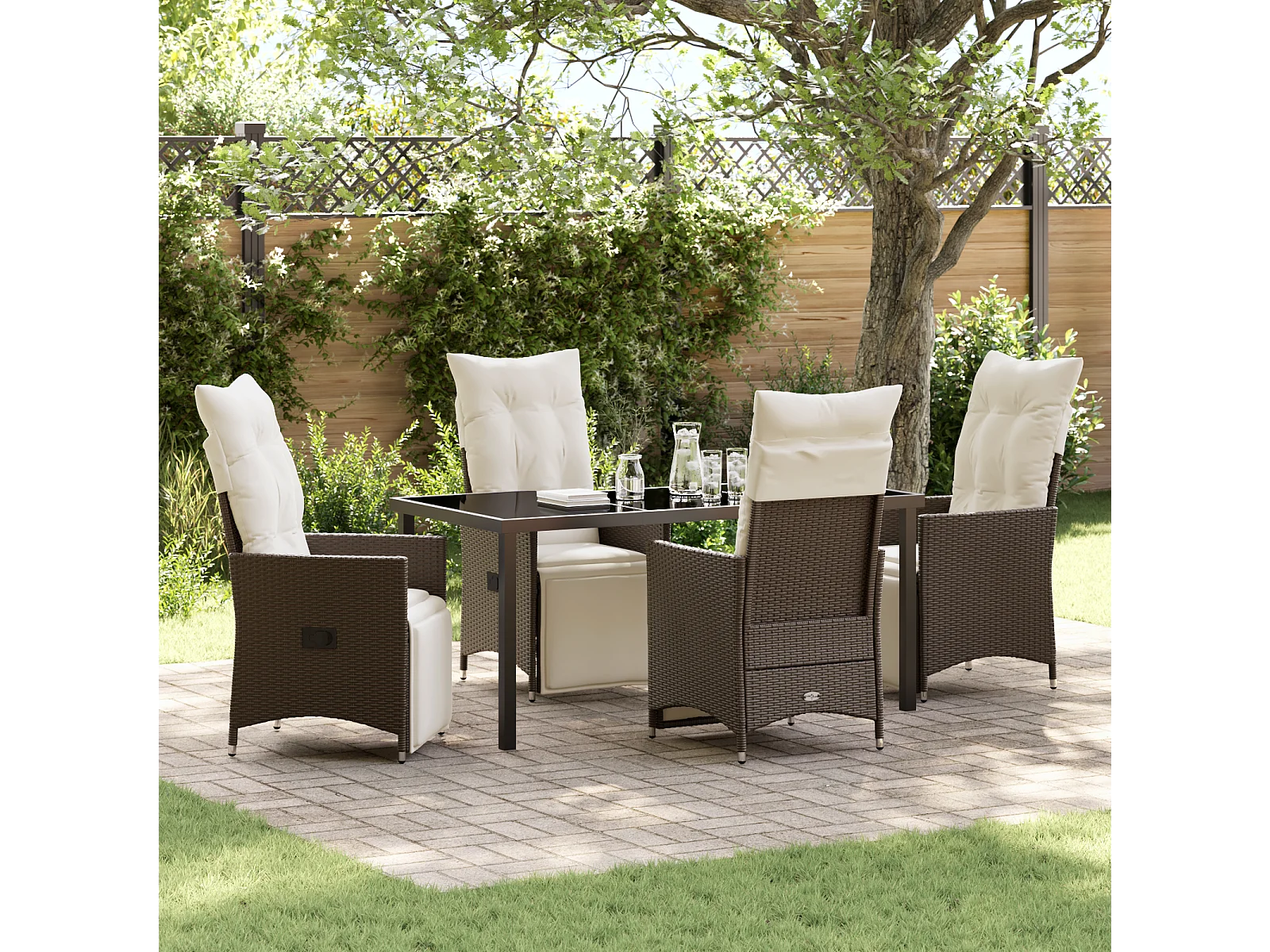 Ensemble de repas de jardin 5 pièces avec coussins marron en rotin poly