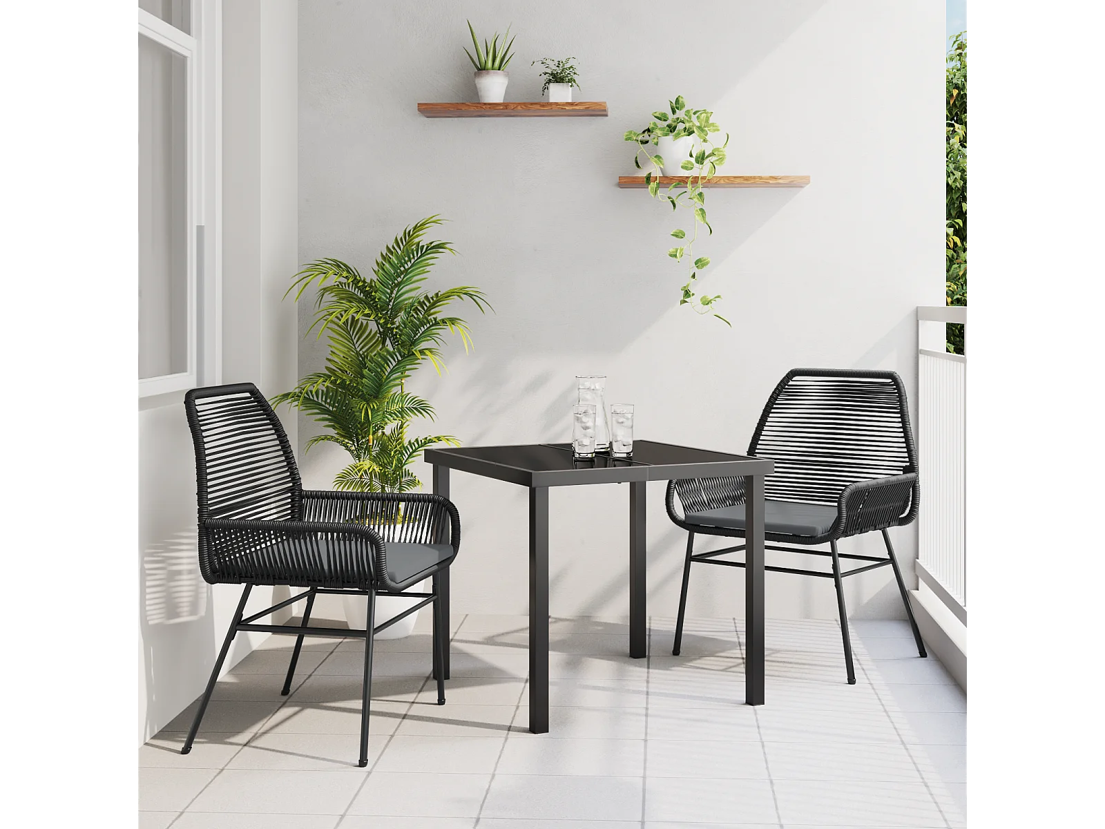 Ensemble repas jardin 3 pièces avec coussins en poly rotin noir