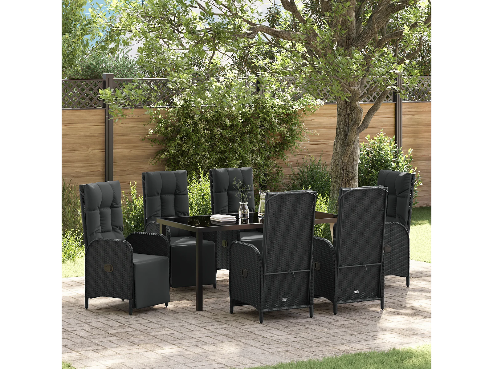 Ensemble de salle à manger de jardin de 7 pièces avec coussins noirs en rattan poly